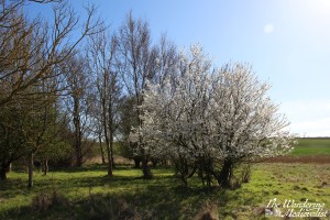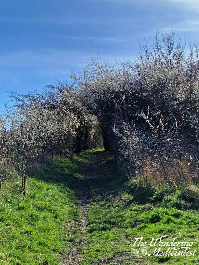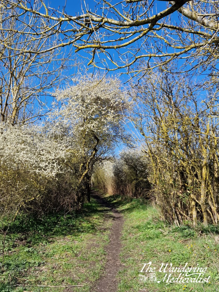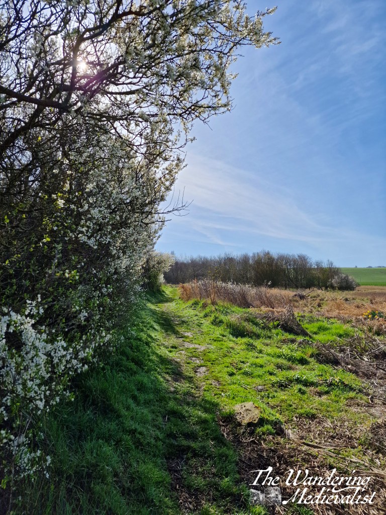 On days like today in the spring there are glorious white blossoms everywhere, and even a small bench you can sit on if you wish to enjoy the view. One advantage of this walk is that it is almost impossible to go the wrong way or get lost, instead you just follow the path along the edge of the field until it curves around and leads you through a tunnel of lovely bushes.