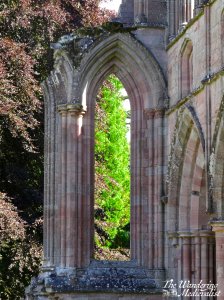What is left allows for a good sense of the scale of the abbey. The pinkish-red stones are stunning in the sunlight, the shapes of the windows and arches still eye-catching.