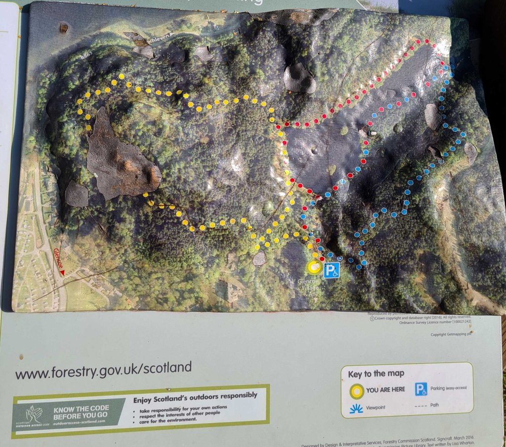 This series of walks around Glencoe Lochan was one of the last we did, but also one of our favourites. The trails start in what is now a well-marked car park, and there are three options. The shortest, and the one that is advertised as being wheelchair and pram accessible, is the red trail.