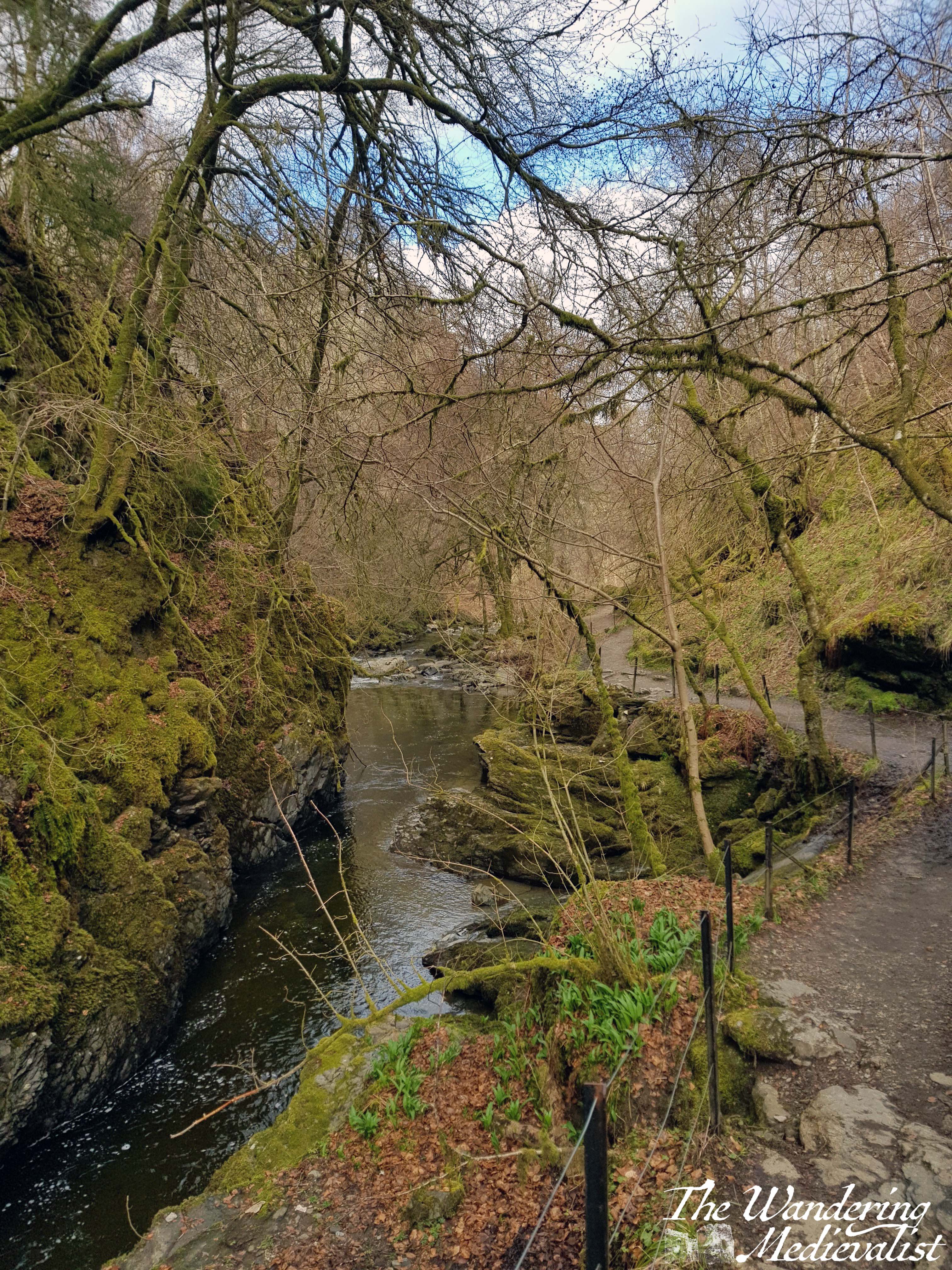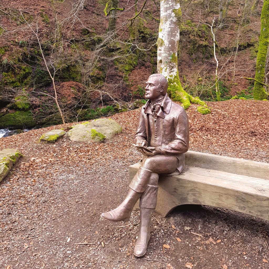 The start of the trail is relatively gentle, following the Moness Burn as it rushes over rocks and smaller falls. The statue portrayed at the top of this post is in a lovely wide clearing, indicating where Robert Burns may have first been inspired to write; one can understand this inspiration!