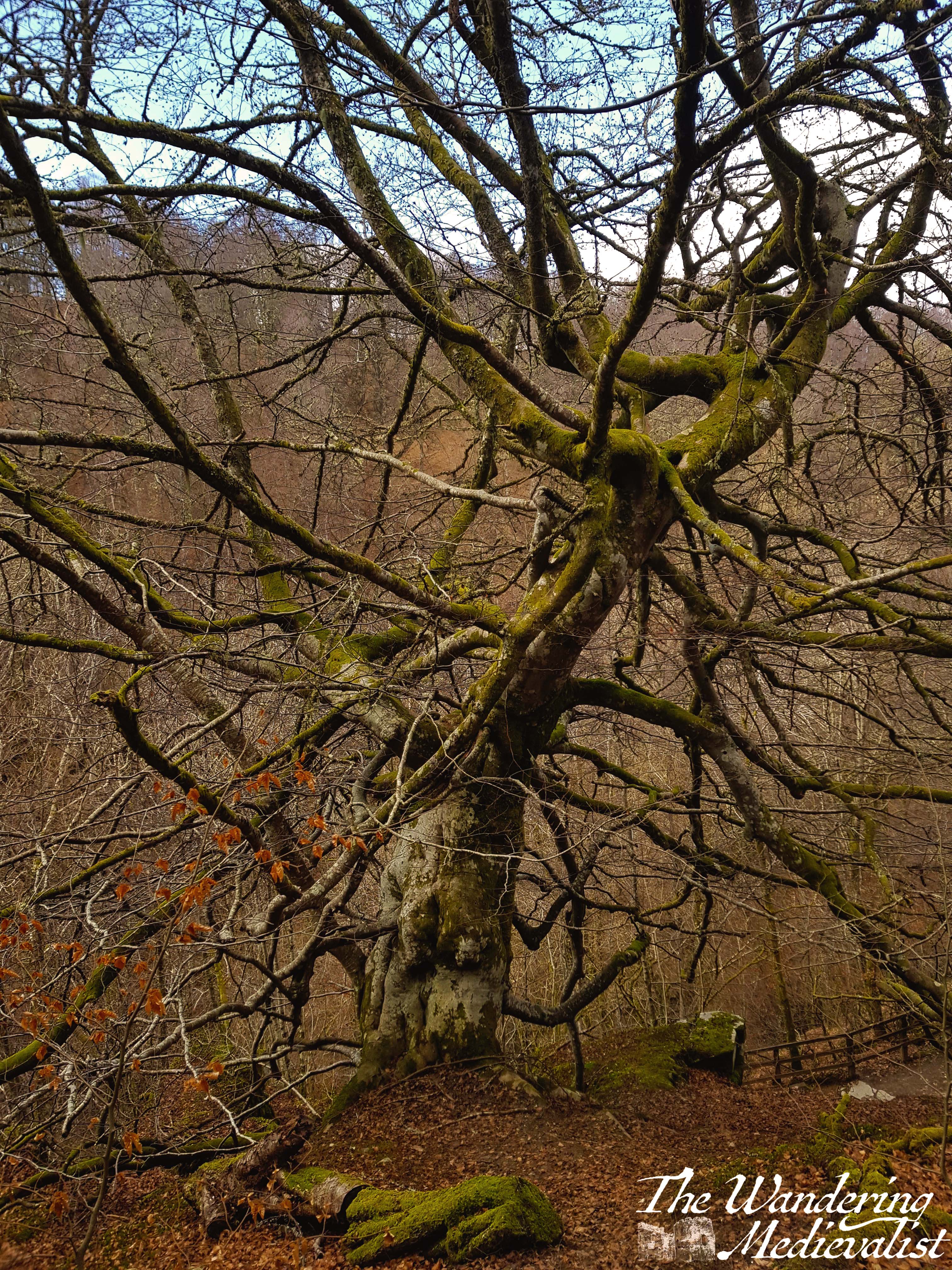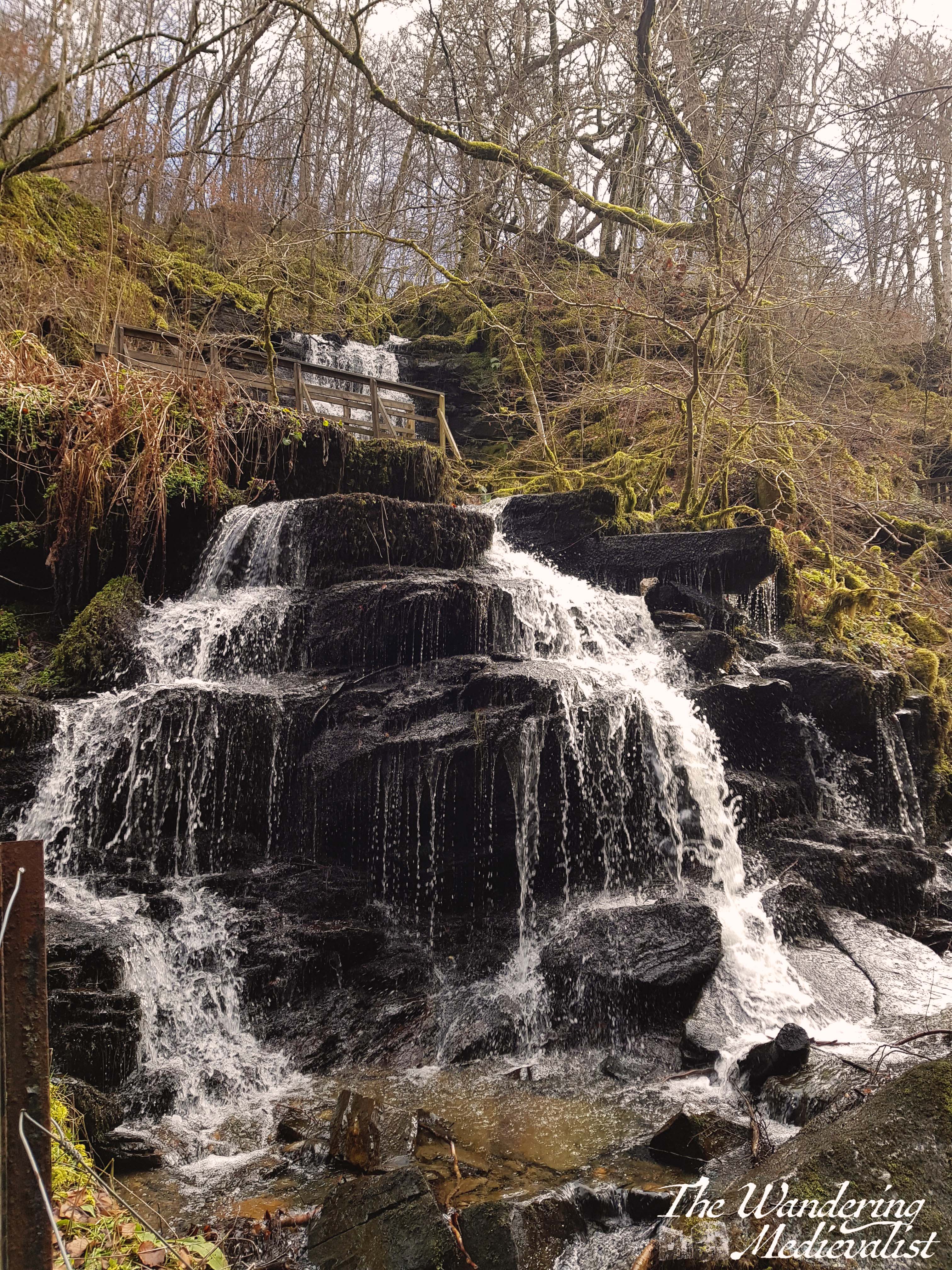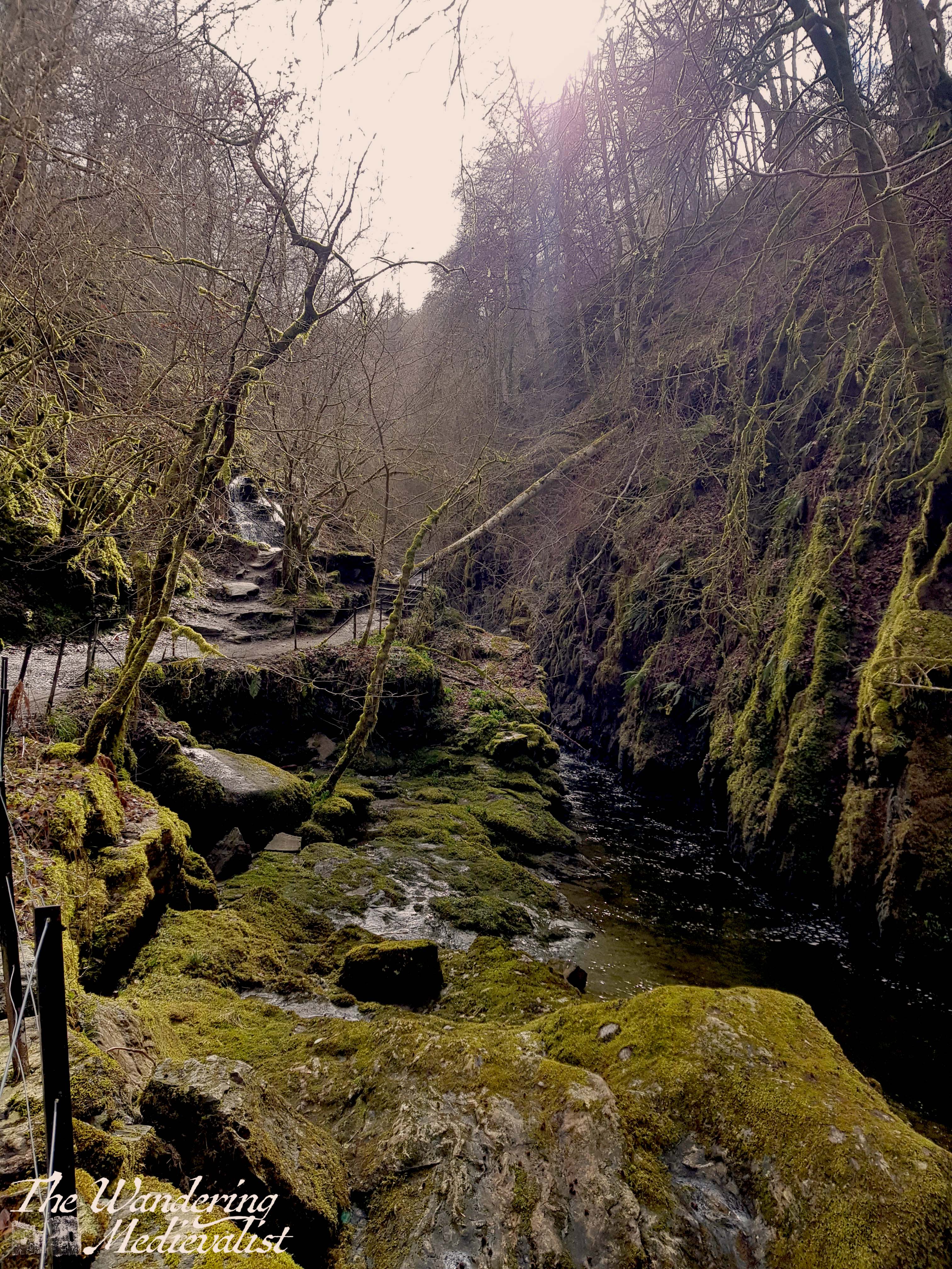 Staircases like the one above wind up the gorge and away from the burn, and at the top of one I was delighted to see the tree on the right, which reminded me of something out of Sleepy Hollow – I half expected it to come alive.