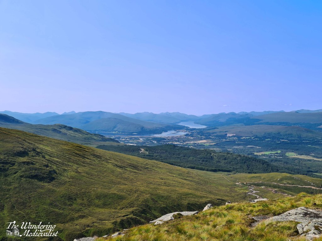 I find the peaty water tumbling through the heather and boggy land to be fascinating and beautiful, but nothing is as impressive as the view from the end of the walk. Like at the other viewpoint, there is a guide showing you what you are looking at, and there are series of both benches and rocks to perch on as you enjoy the vista. I could quite happily sit for hours, I think, watching the clouds (if there are any) and taking in the awesome sights of the view down and also back up the valley and to the sweeping height of Ben Nevis.