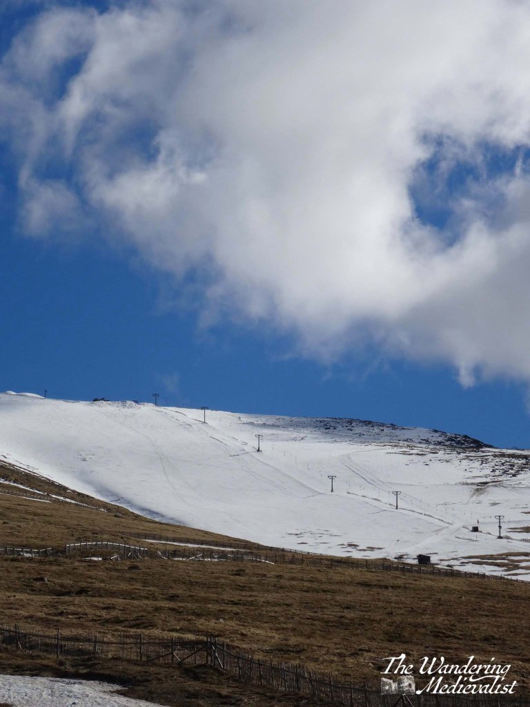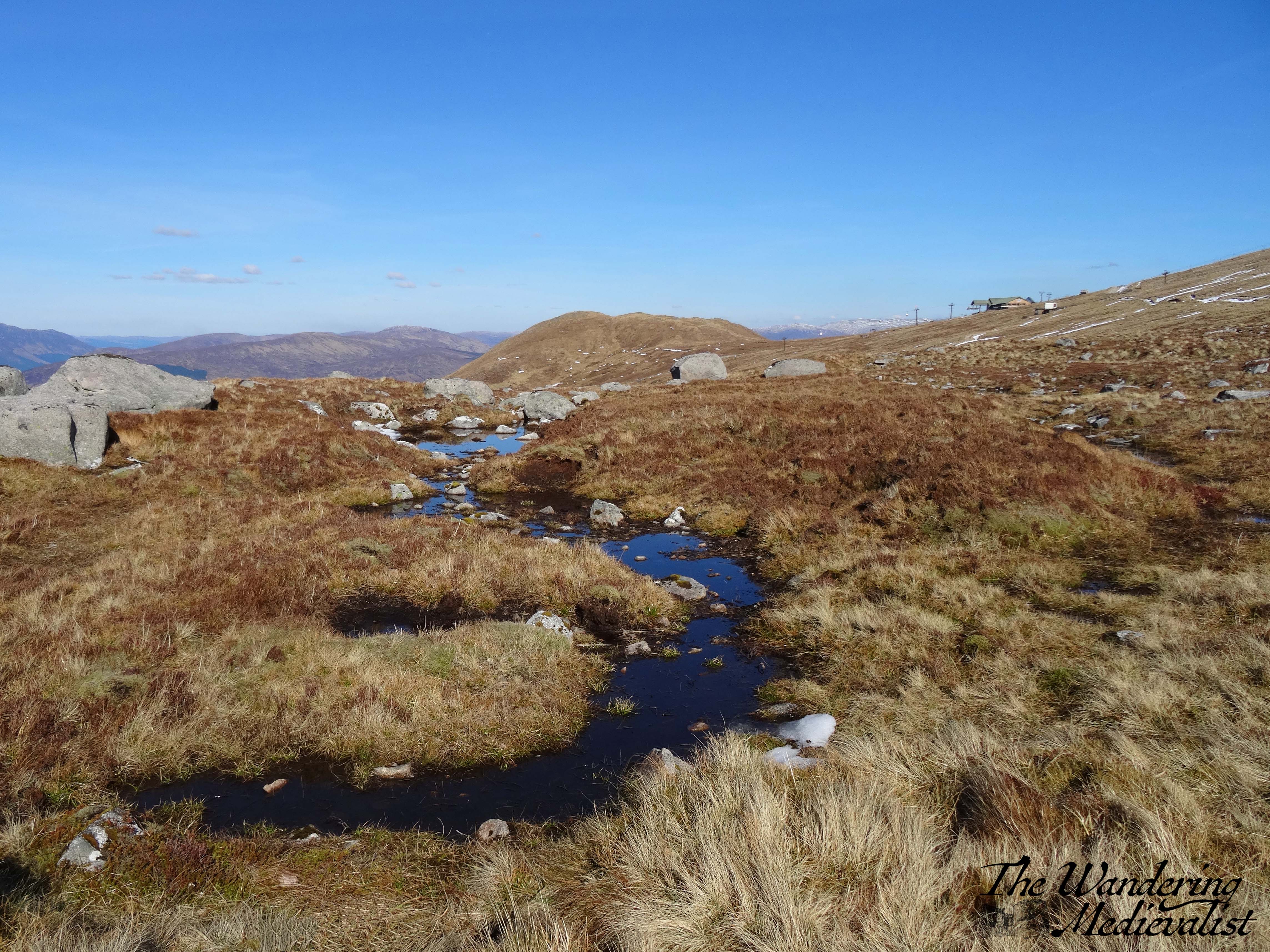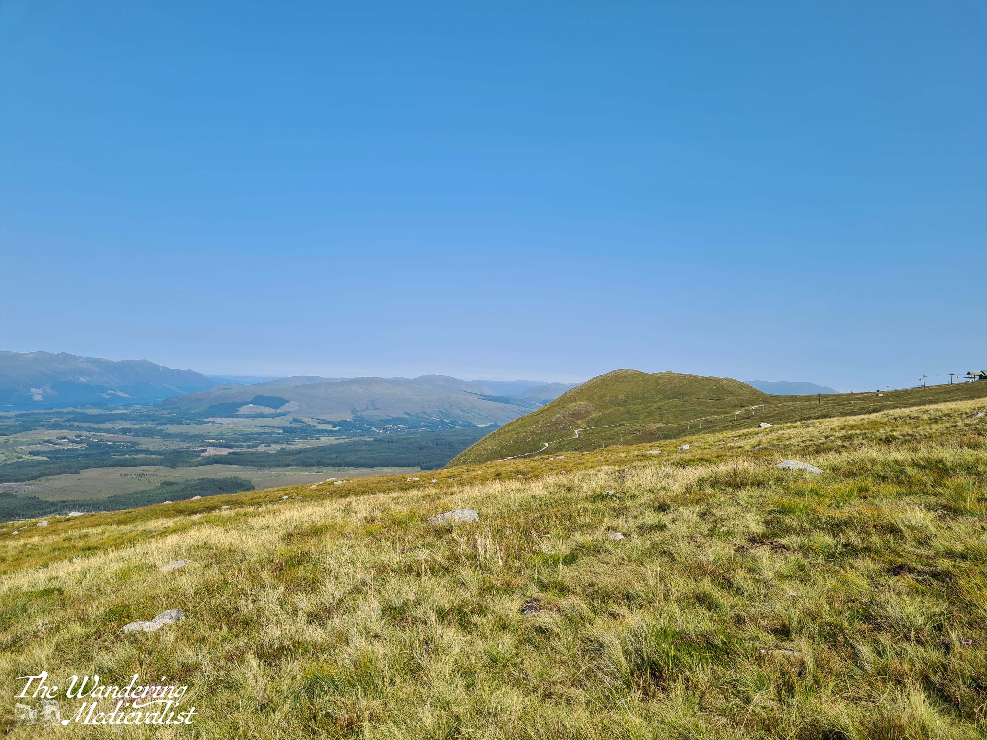 Eventually, it passes under the lift and continues along the side of hill, rising and falling and crossing over a number of small burns. Eventually, you can turn and look back at the café and gondola in the distance.