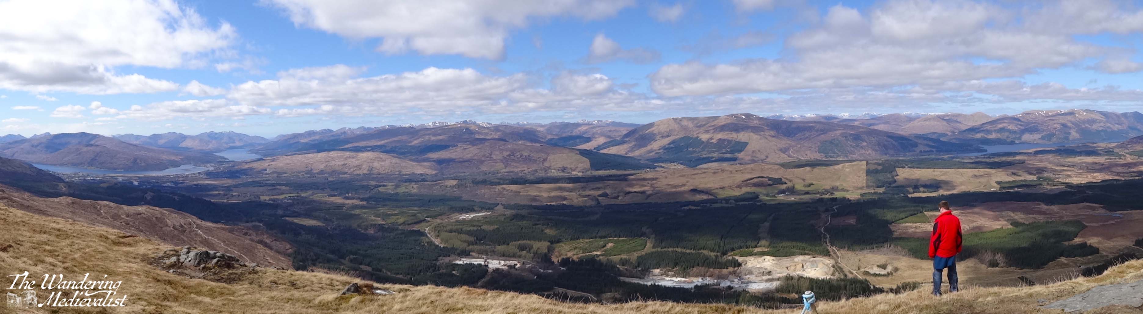 For some reason it took us until our second trip up the gondola to try the second, longer hike to the second viewpoint. I feel that referring to it in any way as ‘long’ is a bit misleading – the whole walk, out and back, is an hour at most and I think Dad and I did it faster. There are a few hilly bits but nothing overly strenuous, and the views are even better than from Sgurr Finnisg-aig. In fact, I realised on my second visit, that this viewpoint qualifies as one of my favourite places in Scotland, if not the world. From the benches or rocks, you can see west and a bit south to Fort William and Lochs Linnhe and Eil, east towards Spean Bridge, but you have a spectacular view of the back of Ben Nevis, all swept rocks and snow.