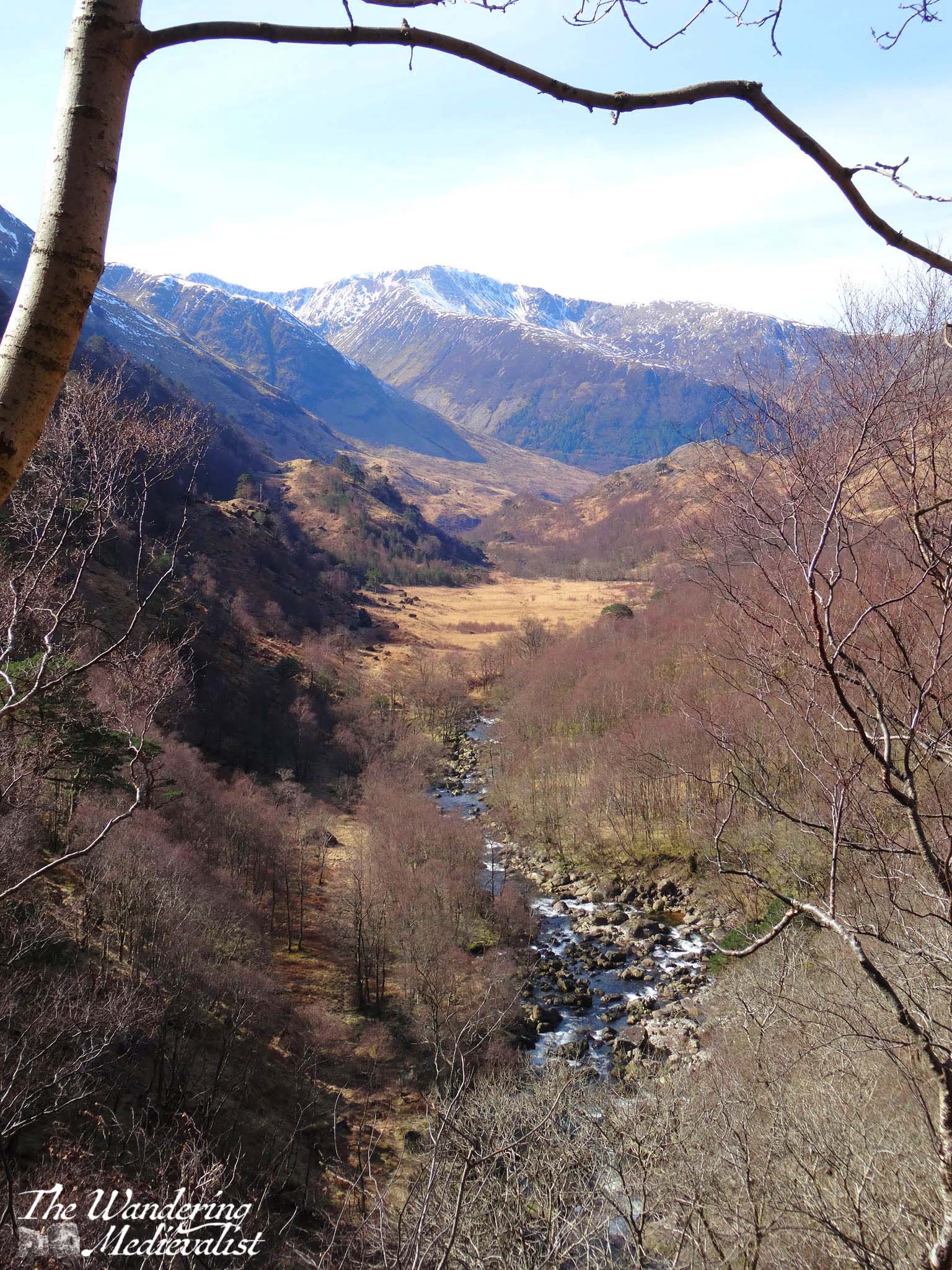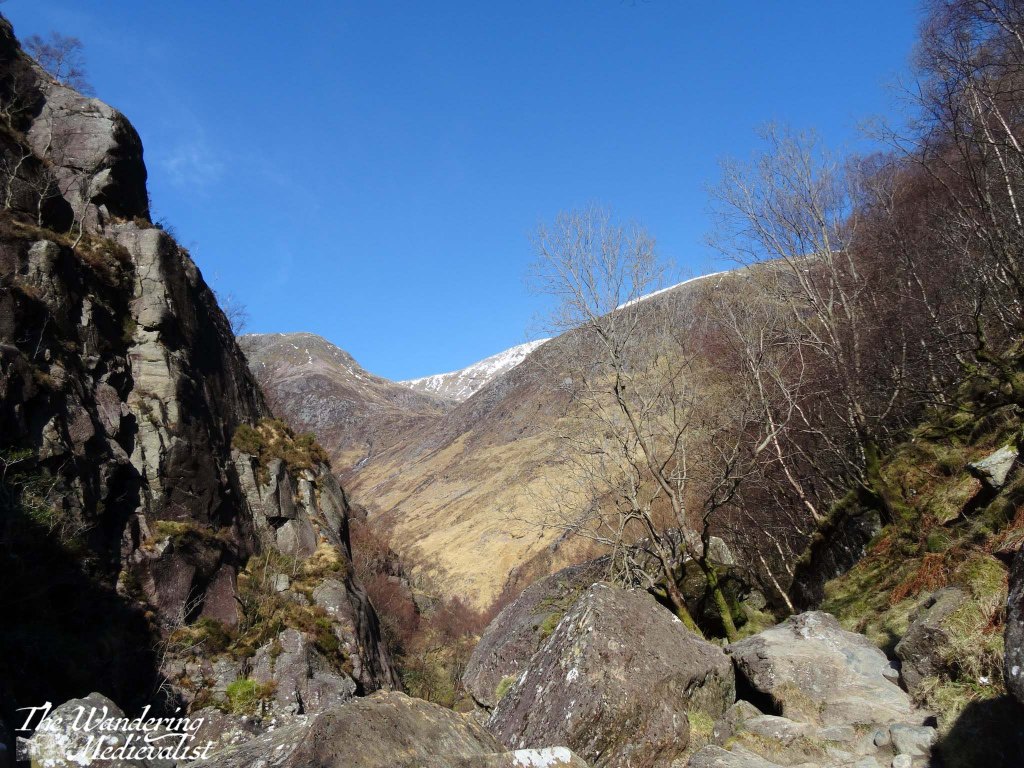 The path starts out quite innocuously through a lovely stand of birch, with some small streams and impressive glimpses through the trees up the hillside and down into the valley where you can hear – if not always see – the Water of Nevis. Before long, though, the trail runs into the side of the hill and begins to curve around to the right, at the same time that it starts to gain height. It narrows and becomes a bit more difficult to traverse, as it is clear that hikers are moving up and through the gorge. Warnings notwithstanding, it is impossible not to stop at a few points to enjoy the view over the glen – below you will see an early spring and late summer version of the view.