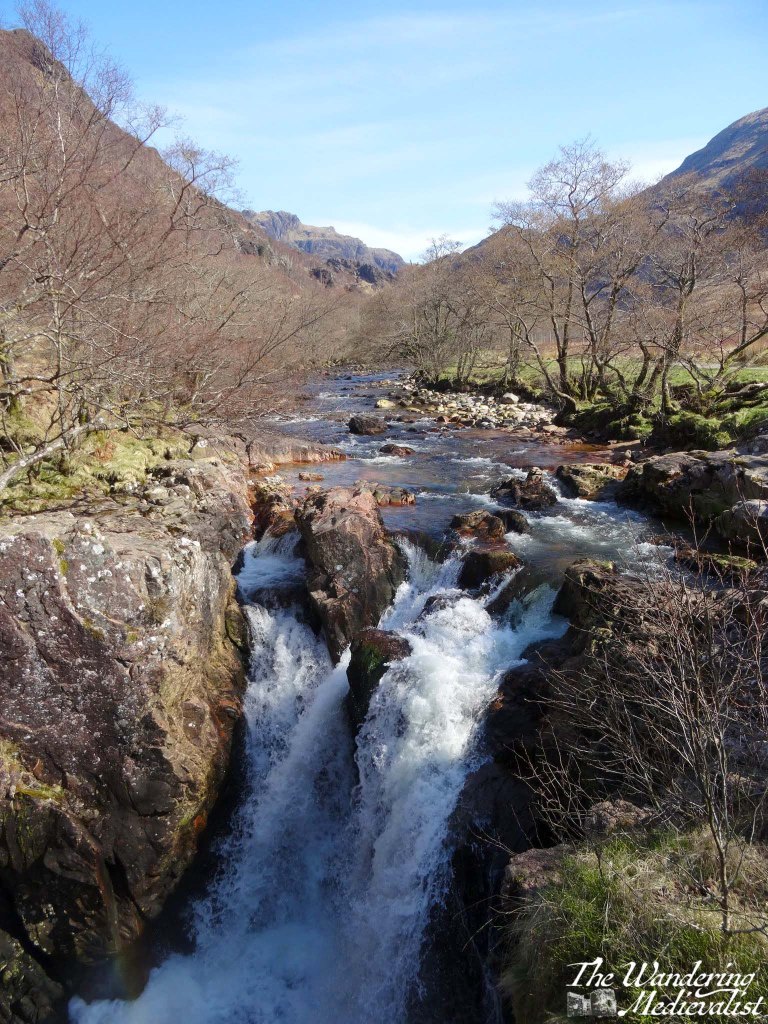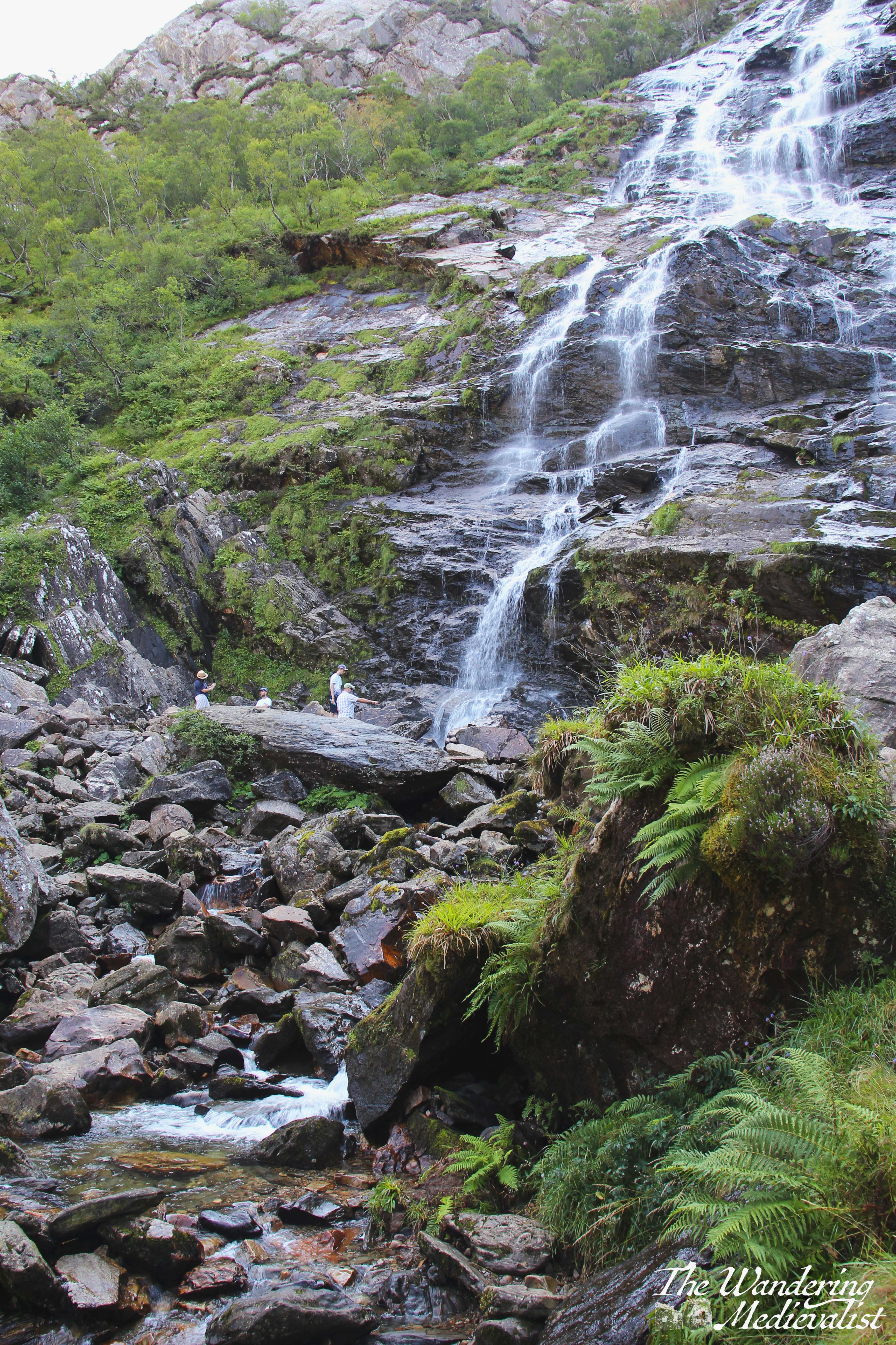 Once safely across, we hiked up towards the falls and I experienced the true viciousness of midges in the Highlands – fortunately I had spray, but the closer I got to the falls, the more swarmed around me, getting caught in my hair and the spray on my arms. While they did not bite through the spray, I ended up looking more freckly than normal and they went out of their way to aim for ears, nose and eyes. I managed to pause long enough for a few pictures of the falls and the view from the rocks, but the bugs were intense enough to encourage us to keep moving.