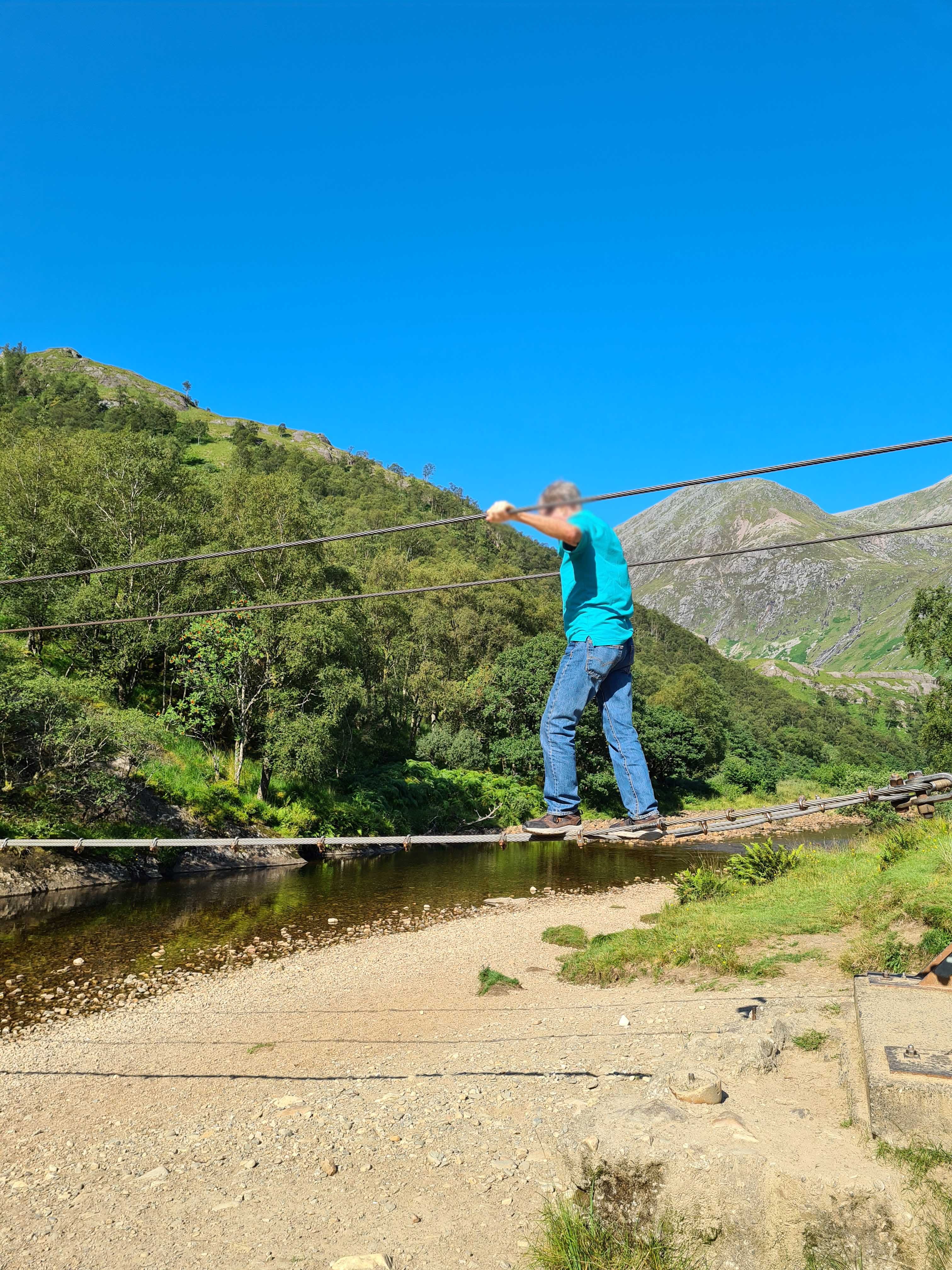 From this point you can continue along the valley up the back of Ben Nevis and eventually reach Spean Bridge or, if incredibly adventurous, the edges of Rannoch Moor. Or, if you are feeling adventurous in a different fashion, you can cross the river to approach the falls directly, though the trail is not as well-marked as one might hope (or wasn’t in the days just after the pandemic). On our first visit, the other half and I chose to just walk up the valley and find a spot on the riverbank for lunch. Dad on the other hand chose to cross the river. Not, as I did, on the rocks just poking above the surface that I crossed dry – unlike the hikers ahead of me – but instead on the wire bridge that spans the river. By wire bridge, I mean literally three heavy wires, one for your feet and two for your arms, which requires both height and upper body strength I do not have – I could not even reach the starting point. While at first the bridge is not far off the ground, by the time it stretches out over the water, it is high enough that one can imagine a fall into the shallow river would not be without injury. After a few uncertain moments at the start, Dad managed it quite well, and then waited on the other side while I plotted my route.