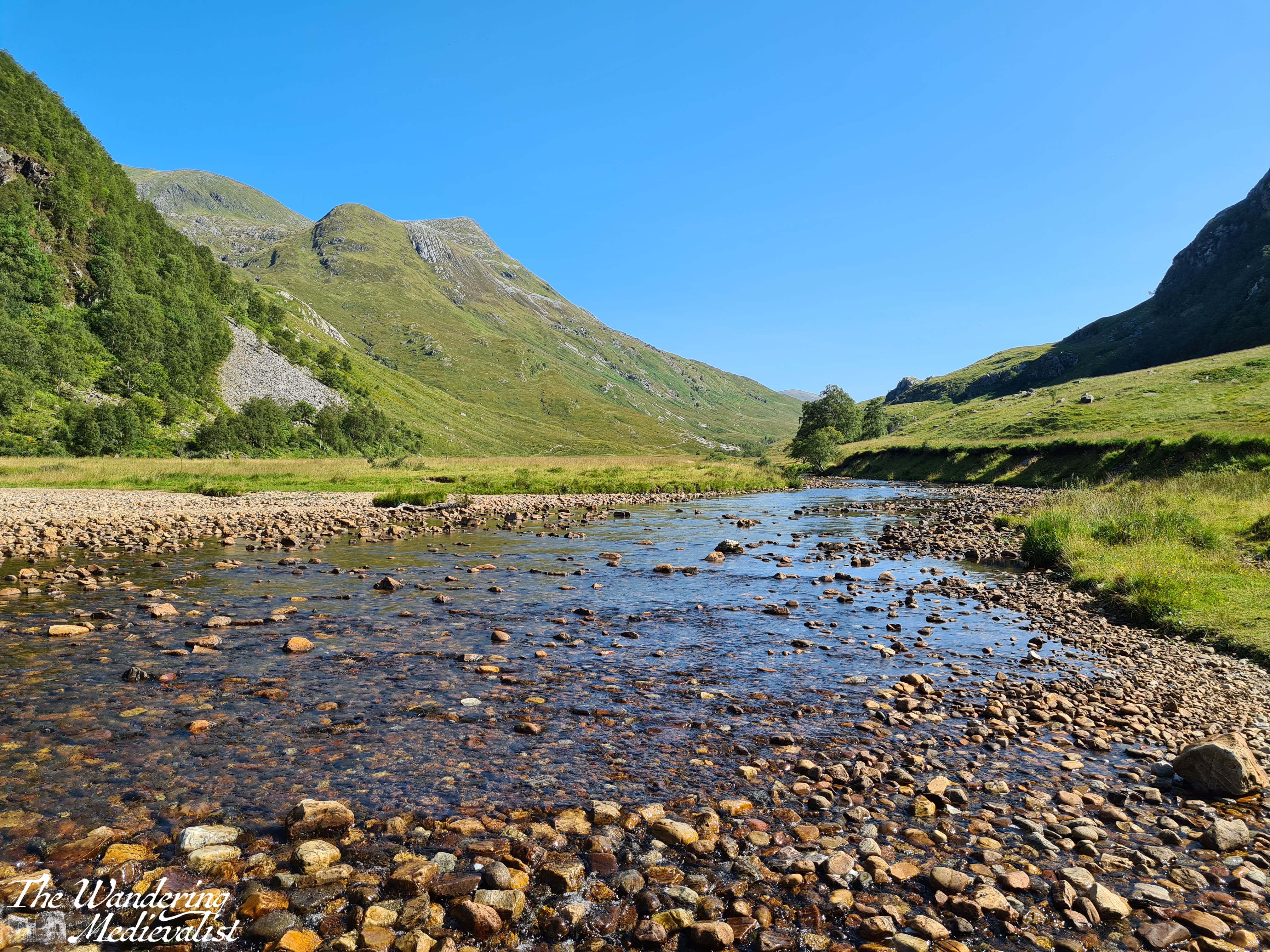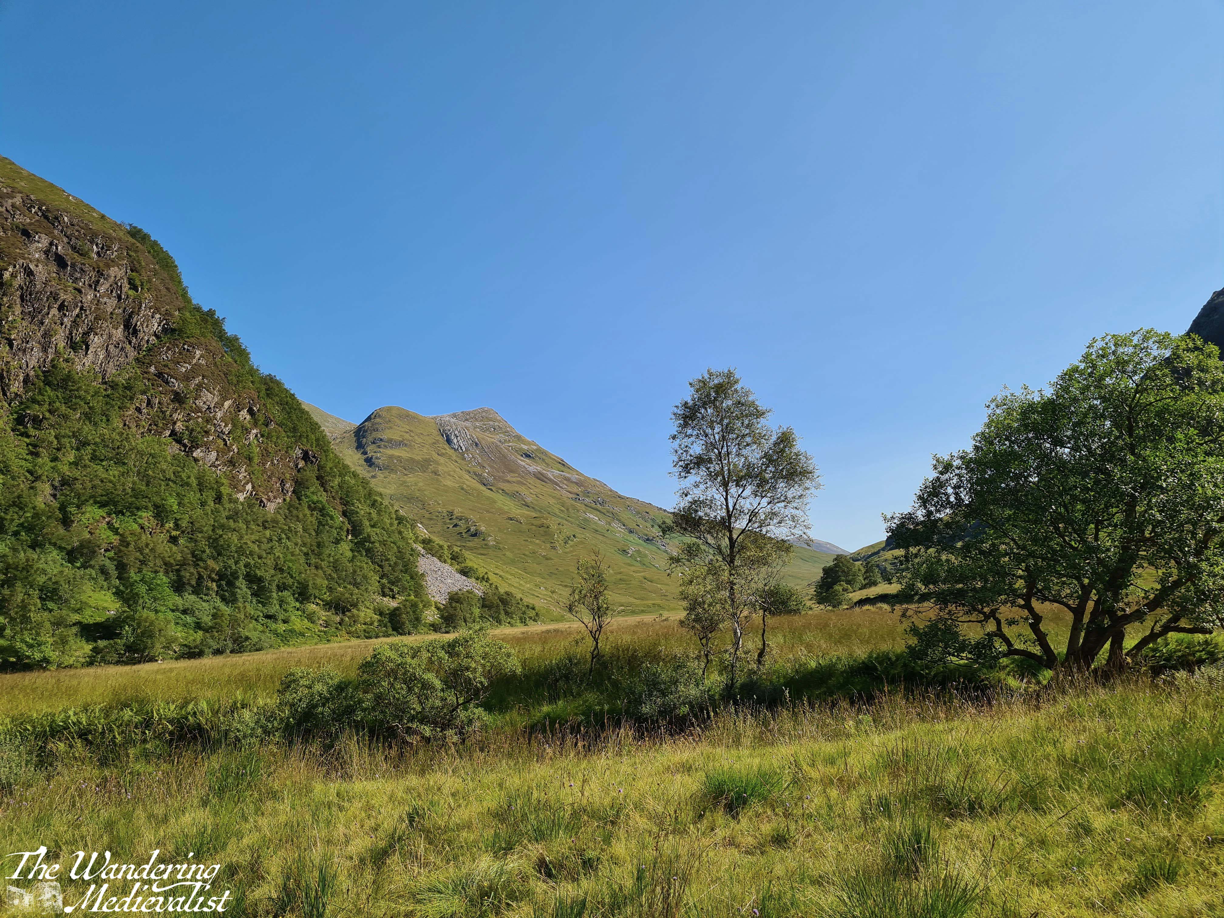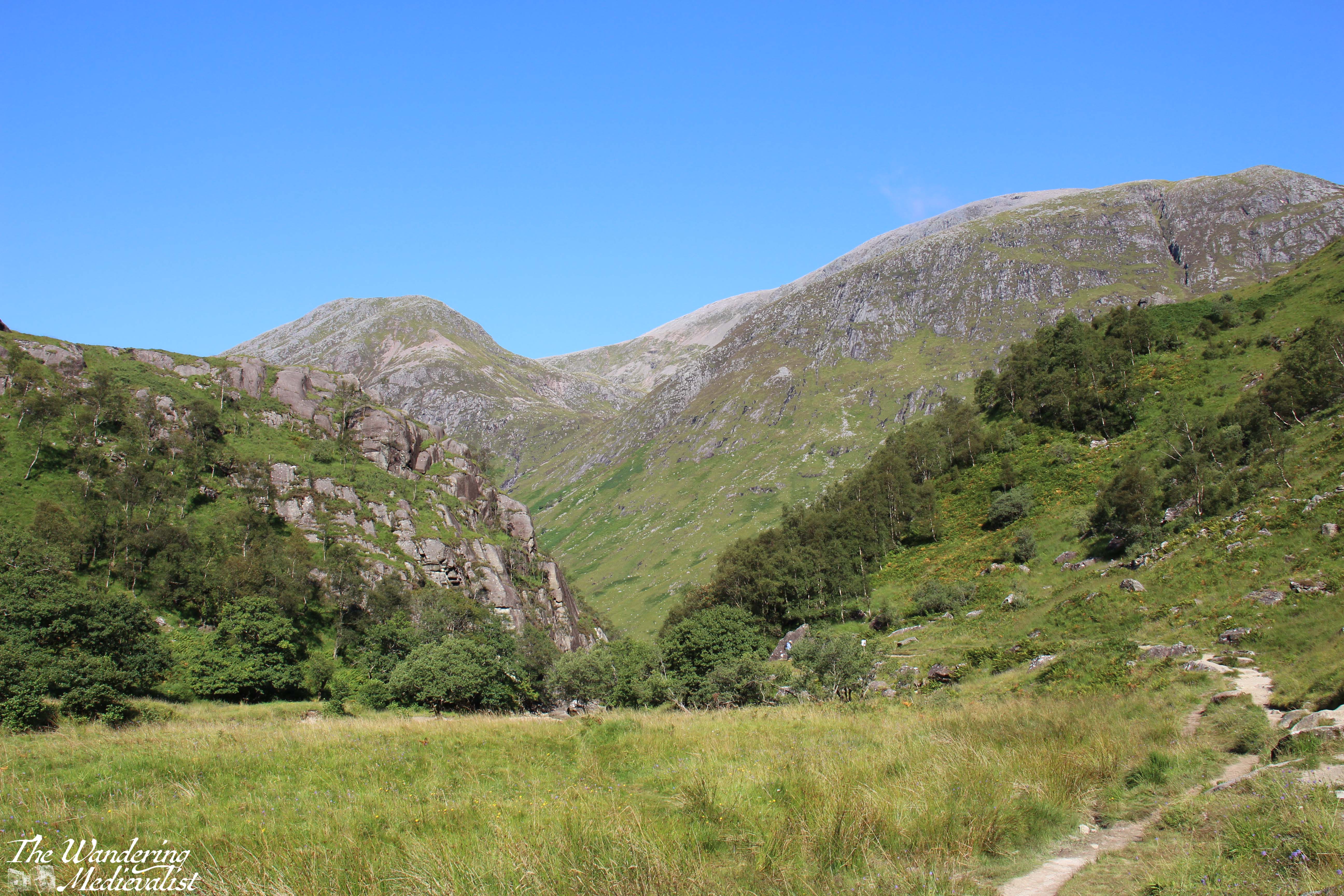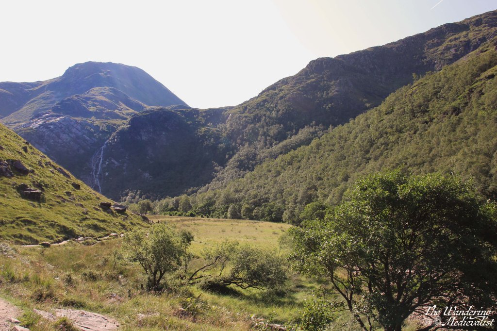 The trail eventually passes through to the other side of the gorge, and before you opens up a beautiful flat valley where the Water of Nevis cuts through the hills. Grassy flat land is dotted with stands of trees and rocks, and in the distance you can just see Steall Falls.