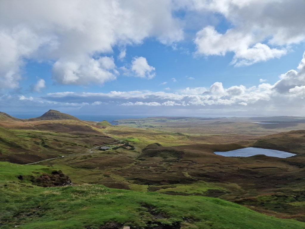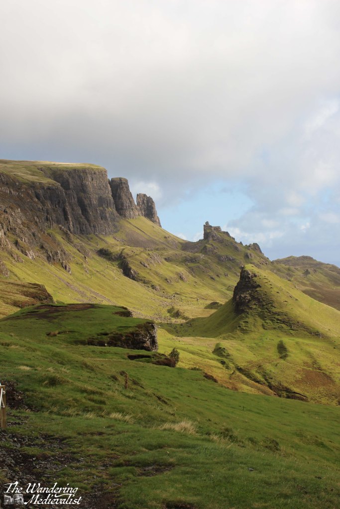 There are a number of path options at this point, including one that is wide and gentle enough that – I think – it is wheelchair accessible. It is certainly easy enough for most to try, and if you ever find yourself here with an elderly or less mobile companion, I would encourage you to encourage them to give it a go, even with wind as strong as it was when we visited – strong enough to take your feet from under you. This sight of the Quiraing, the view across towards the ocean, lochs and hills in between, is one of the most stunning I have ever seen. Top ten in my life, no question. The stunning scenery of the Quiraing is caused in part by a series of landslips, and the sunlight plays dramatically off sharp pinnacles, grassy slopes, and sheer rock faces.
