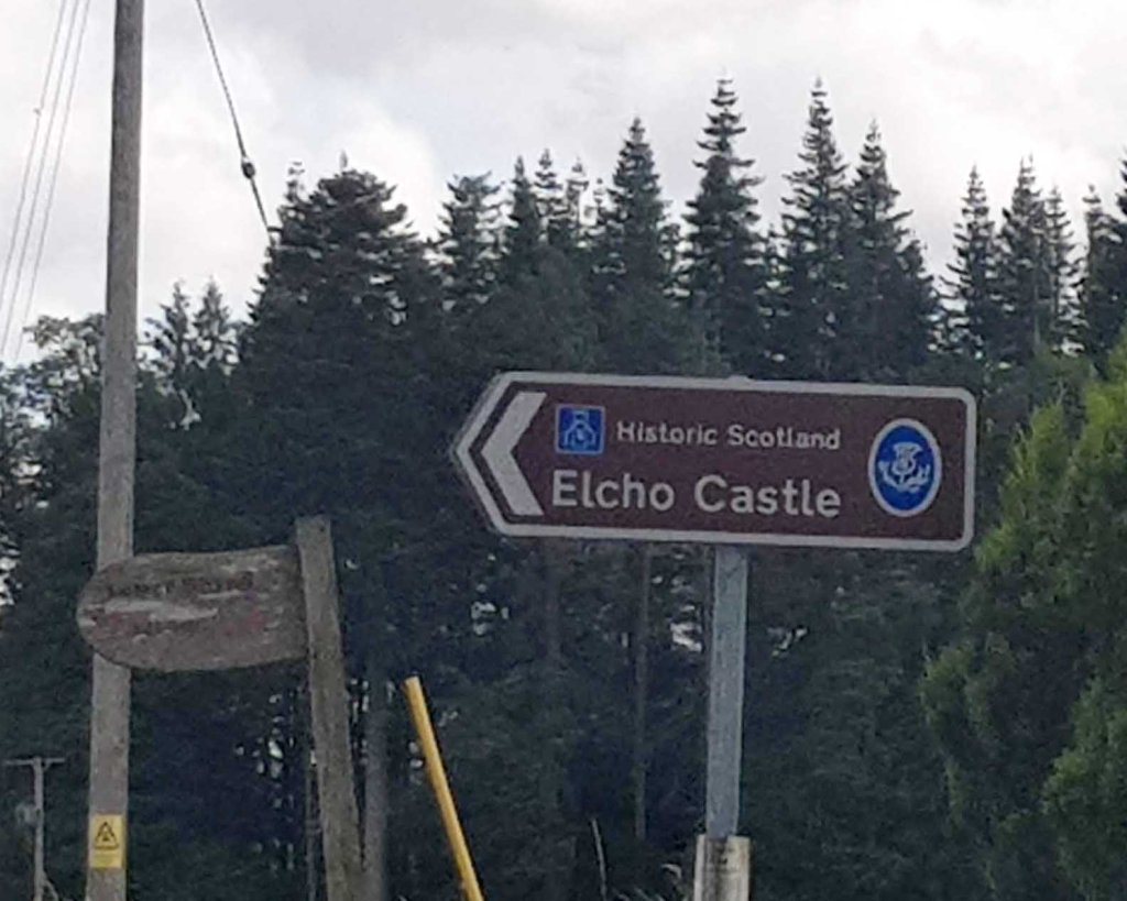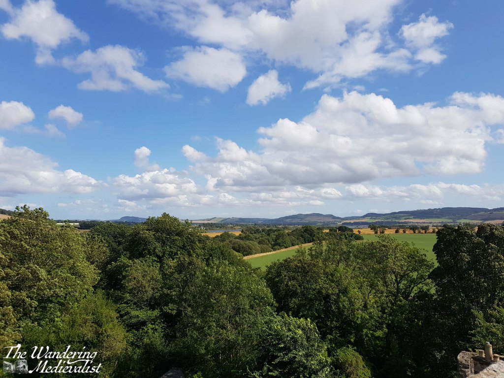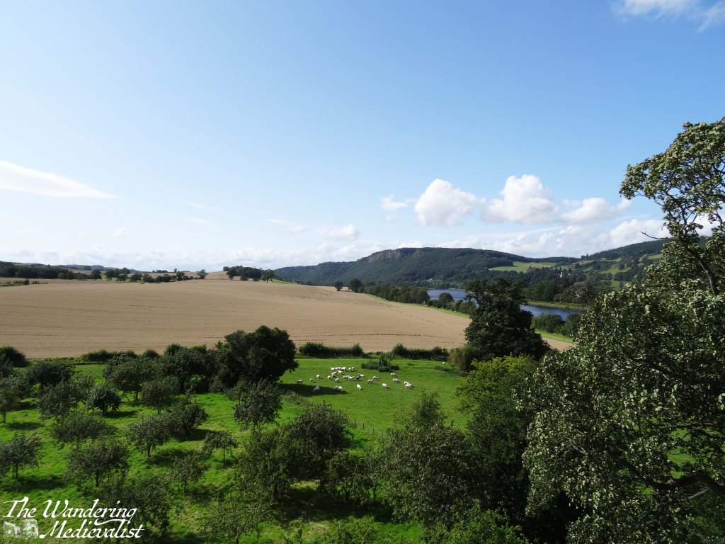 Only four miles from Perth, Elcho is accessed by narrow back roads that eventually lead to a small car park, the castle, and the nearby listed cottage. It was built by the family of Wemyss of that Ilk, around 1560, and is an interesting example of a comfortable country manor residence that was also defensive. It has both guest rooms and gun ports. As one can see from the view from the castle walls, it was happily situated beside the River Tay, amidst fields for crops and sheep, as well as an orchard. In the distance one can just make out the cliffs of Kinnoull Hill.