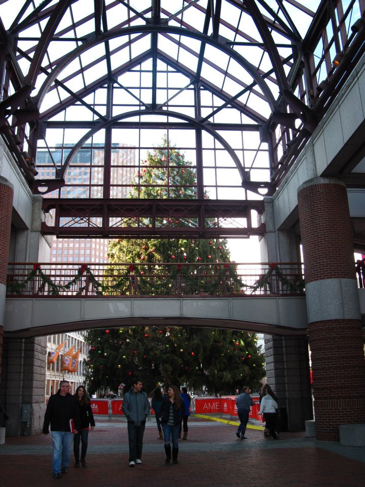 Once across Atlantic Avenue, you will hopefully find yourself immediately before a concrete and metal beam constructed covered walkway, that leads to the market. At Christmas time, there will be a gigantic tree immediately in front of you inside.
