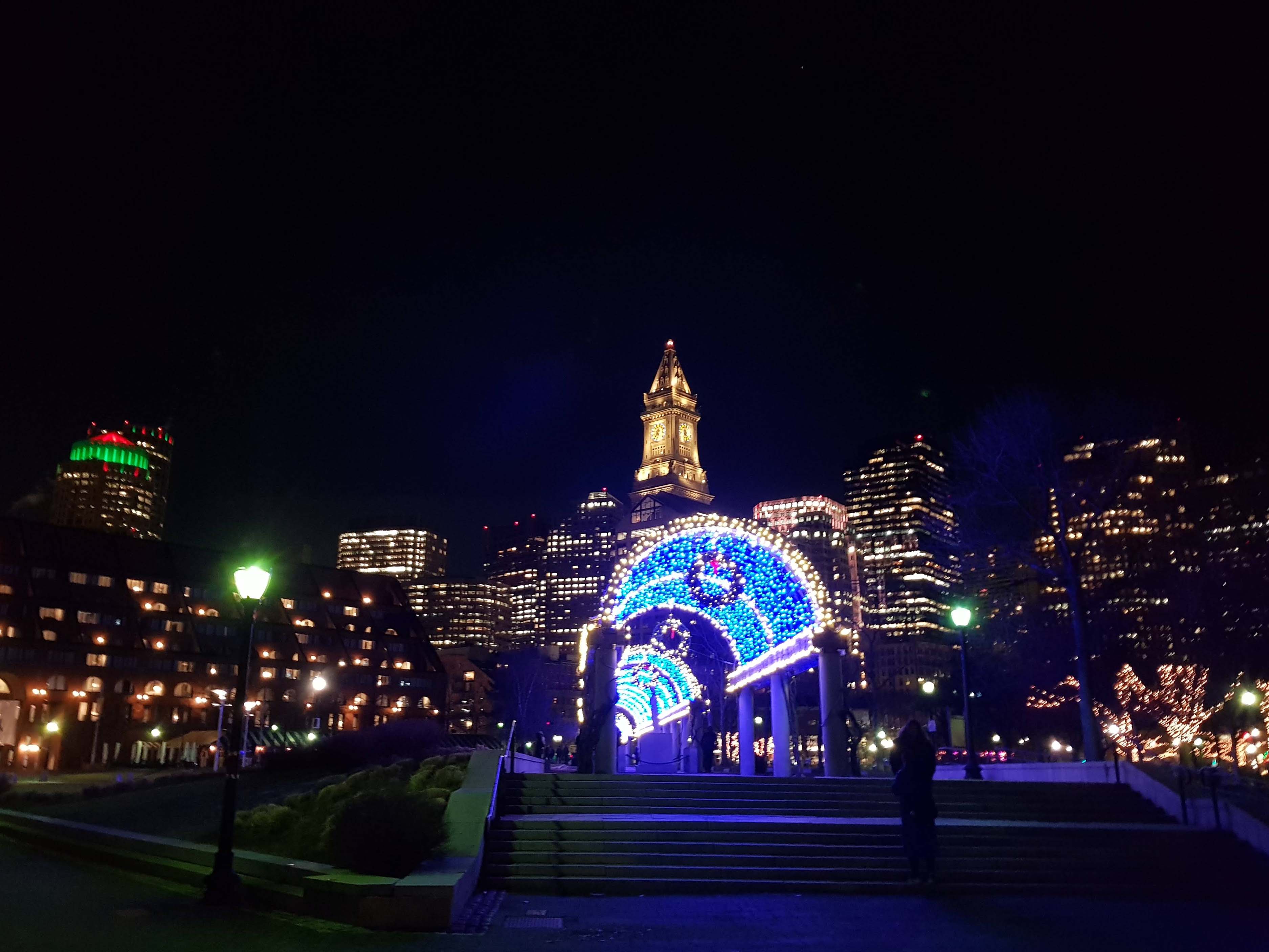 Below are views of the park at night in the winter, and then in the spring, as well as the view from Long Wharf back towards the Custom House.