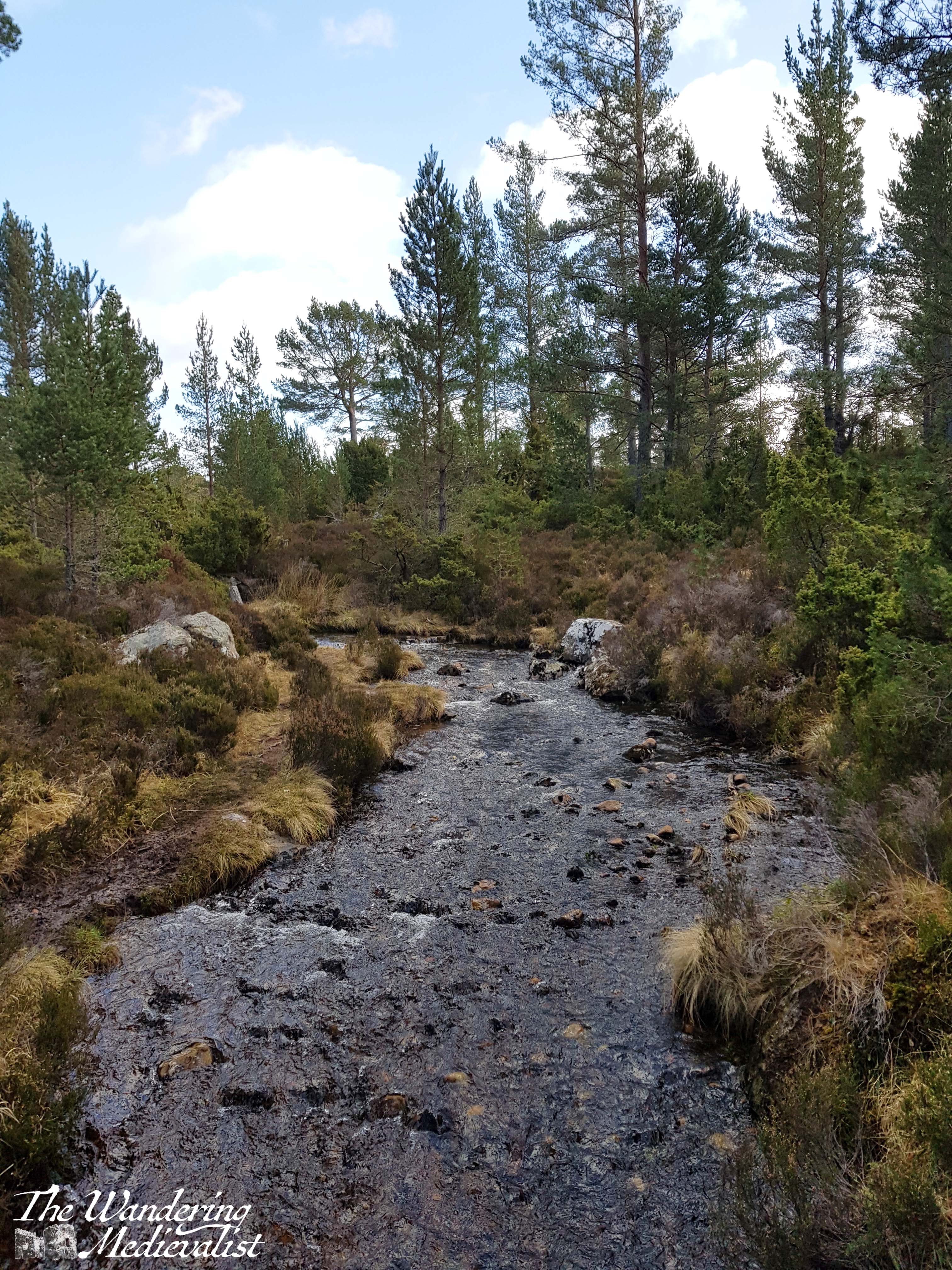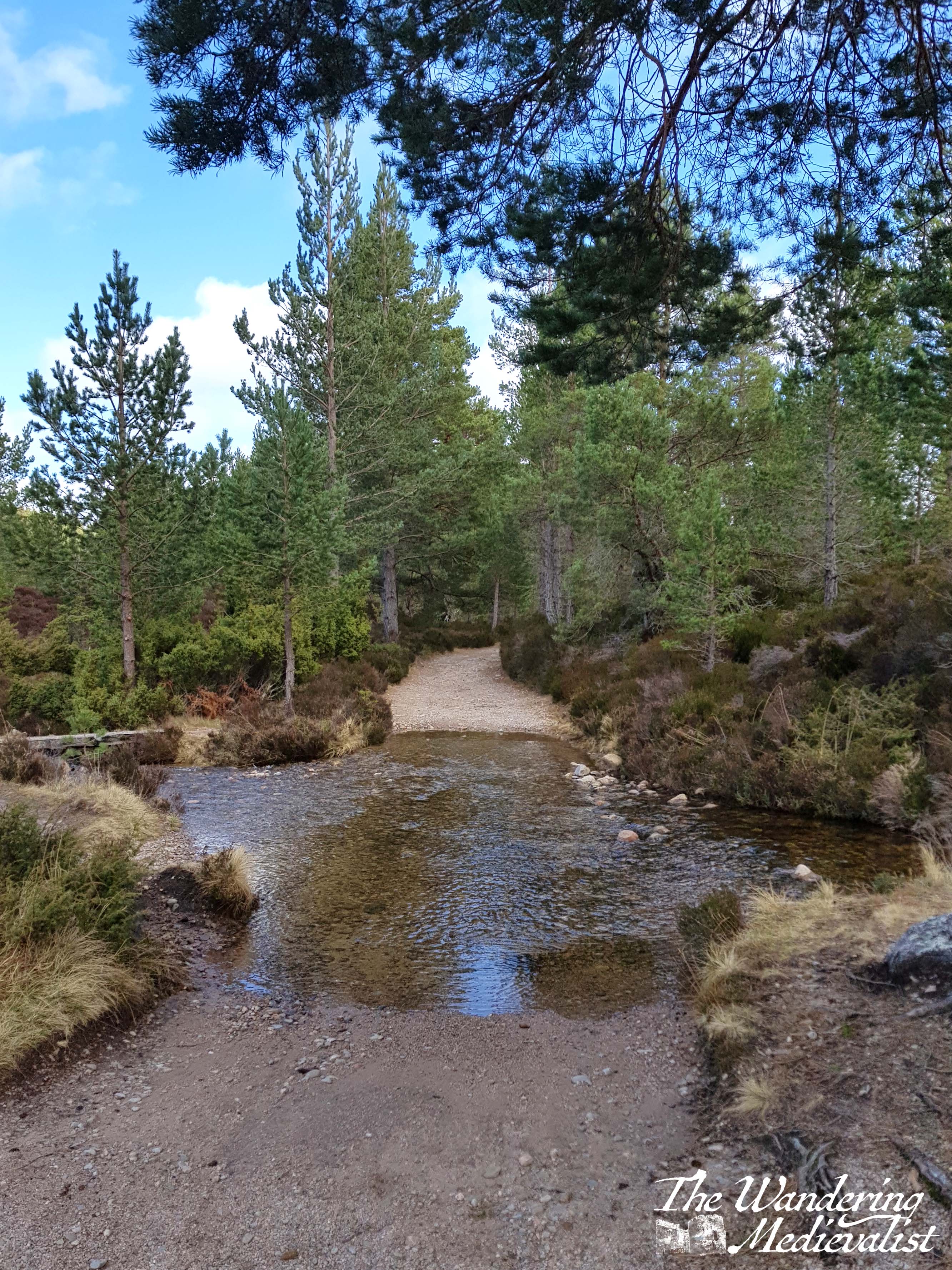 Before long, the path we wished to follow turned east away from the loch. We passed several burns and even crossed one before moving out of the trees and into a flat, more open area with brush on all sides. Much of the open area was quite boggy but the path itself was dry and, for the most part, flat and easy to follow (excepting of course the shallow ford below, which required a bit of careful manoeuvring.)