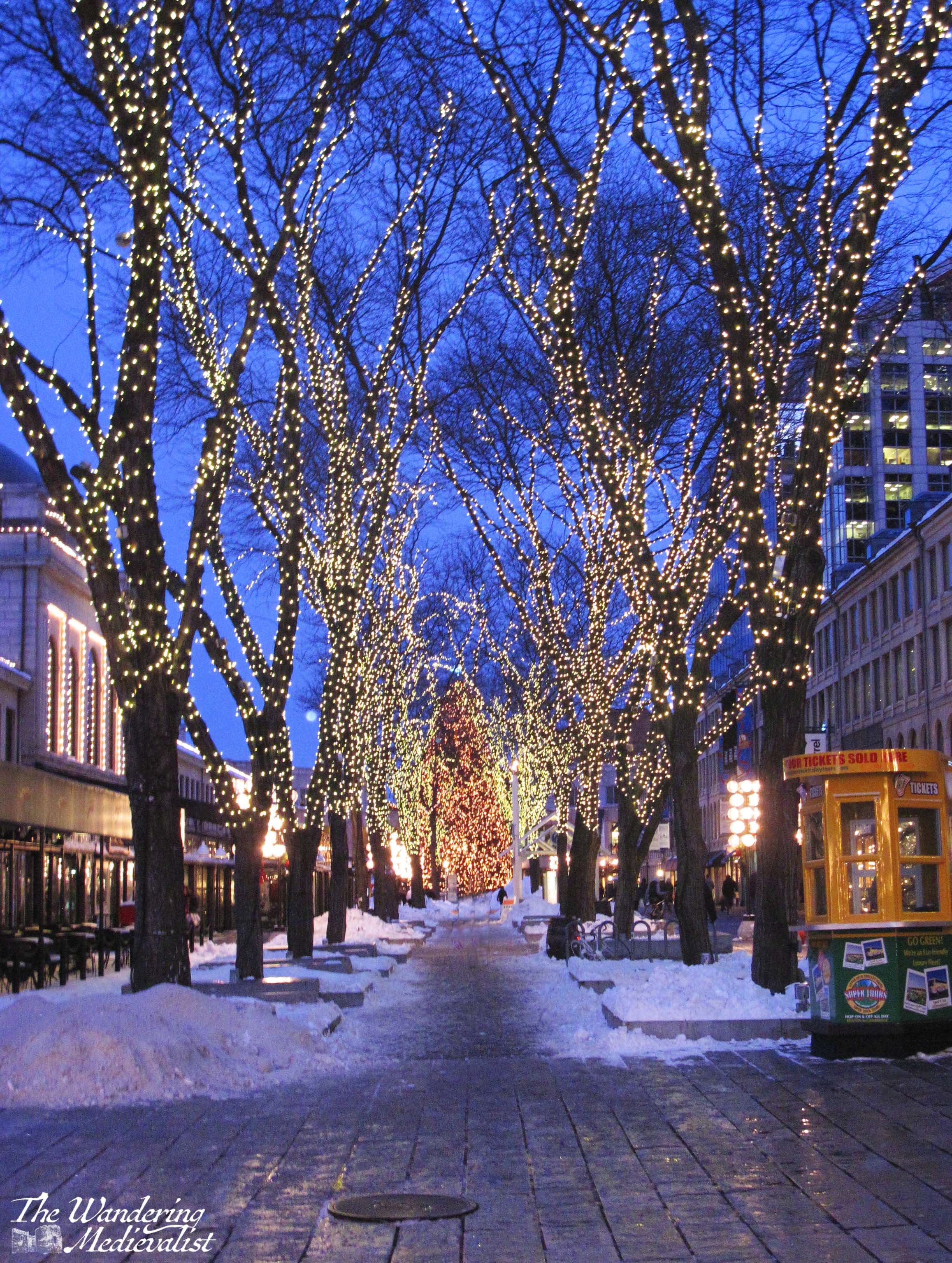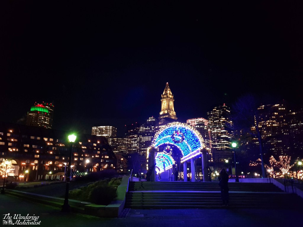 There is a lot to love about Boston at night, though I particularly love the winter lights. When I was young we used to drive into the city every December to see the Nutcracker ballet, and I recall with utter clarity the wonder of driving past the Common to see the trees festooned with lights and every lamppost adorned with a Christmas decorations. The ‘Christmas’ nature has widened to encompass all holidays, and the lights are still stunning.