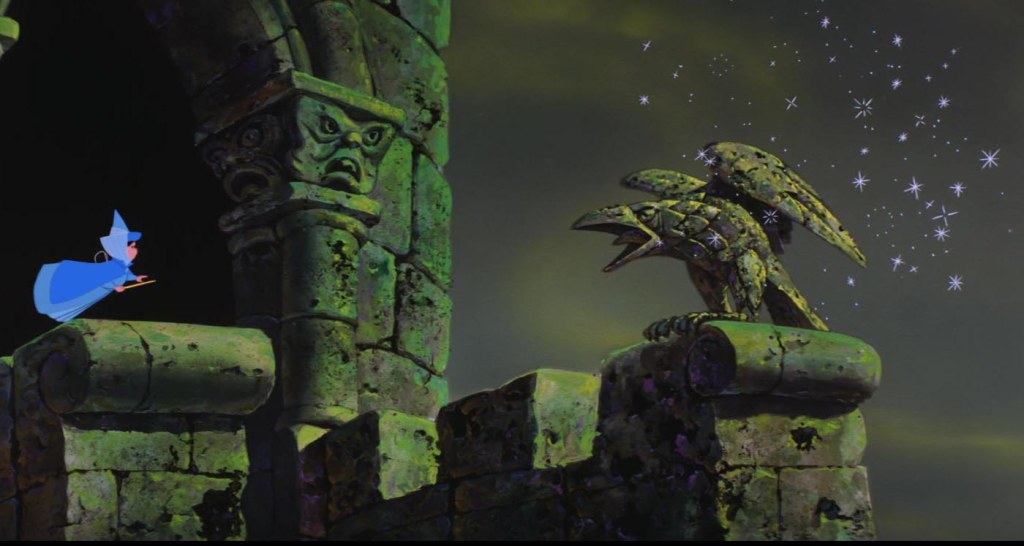 The three fairies brave the Forbidden Mountain to free Prince Philip, and in one of my favourite moments of the movie, an easily frustrated and feisty Merryweather turns Maleficent’s squawking pet to stone.