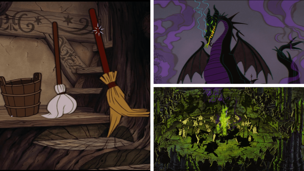 There are anthropomorphic characters such as the friends Aurora meets in the woods and sings to – a common theme for Disney princesses who are often lonely and more likely to have animal companions than human ones – though they do not talk. Some of the artwork is also reminiscent of other Disney works, in particular Fantasia – the self-propelling mop and broom, the evil henchmen dancing around a green fire, and even the dragon which Maleficent becomes in the finale all look vaguely familiar.