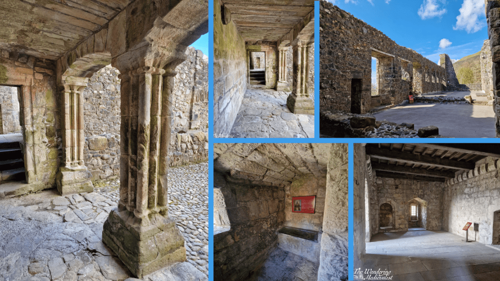 The keep and inner courtyard are still in excellent condition, and the keep is fully enclosed and can be explored by several spiral staircases. Some unique features include the loggia below, several latrines, a prison, and the well-restored chambers with window alcoves and fireplaces evident. On the first floor of the tower, there is a display on the castle and a diorama of what it may have looked like in its heyday, complete with formal gardens.