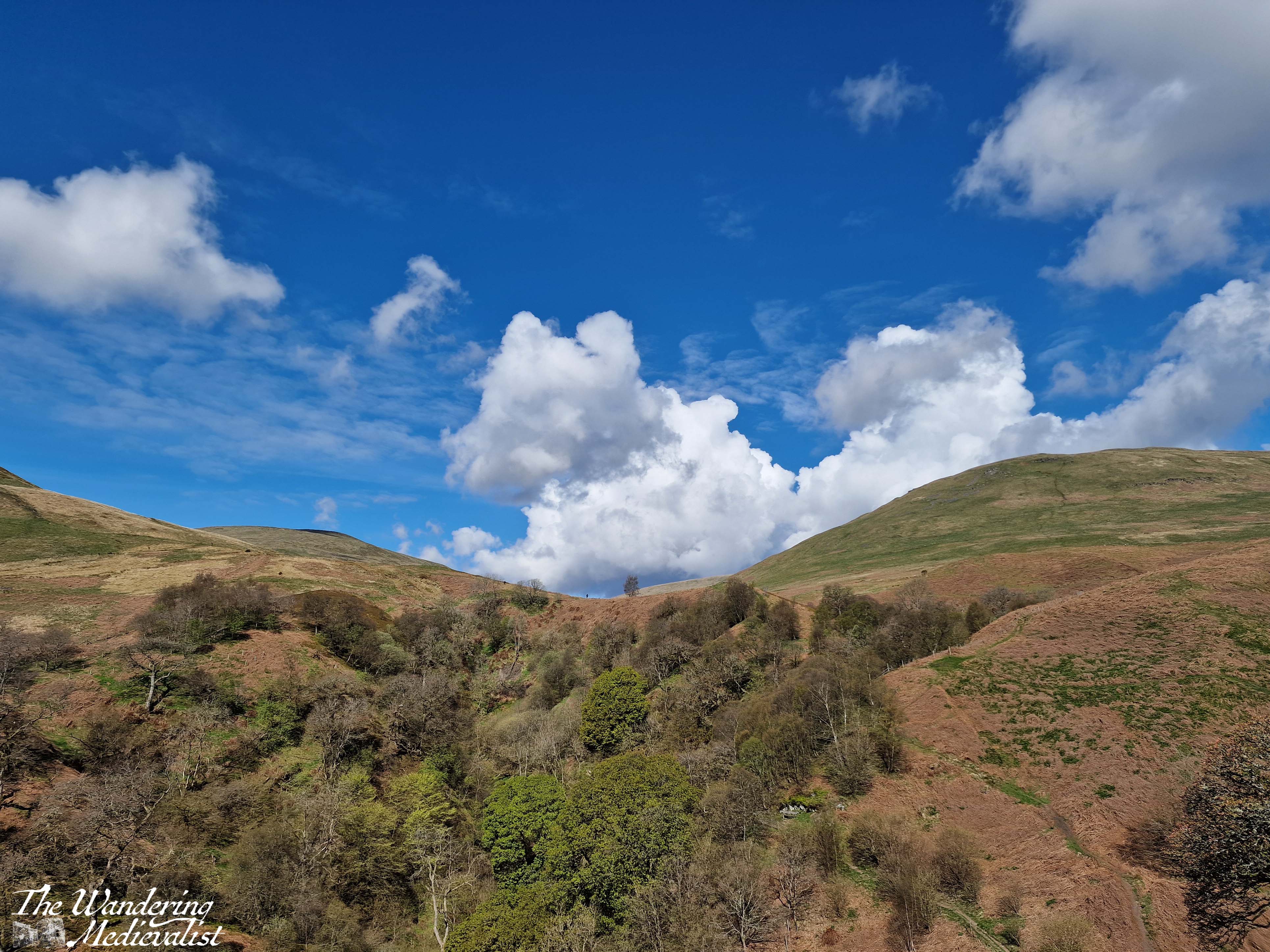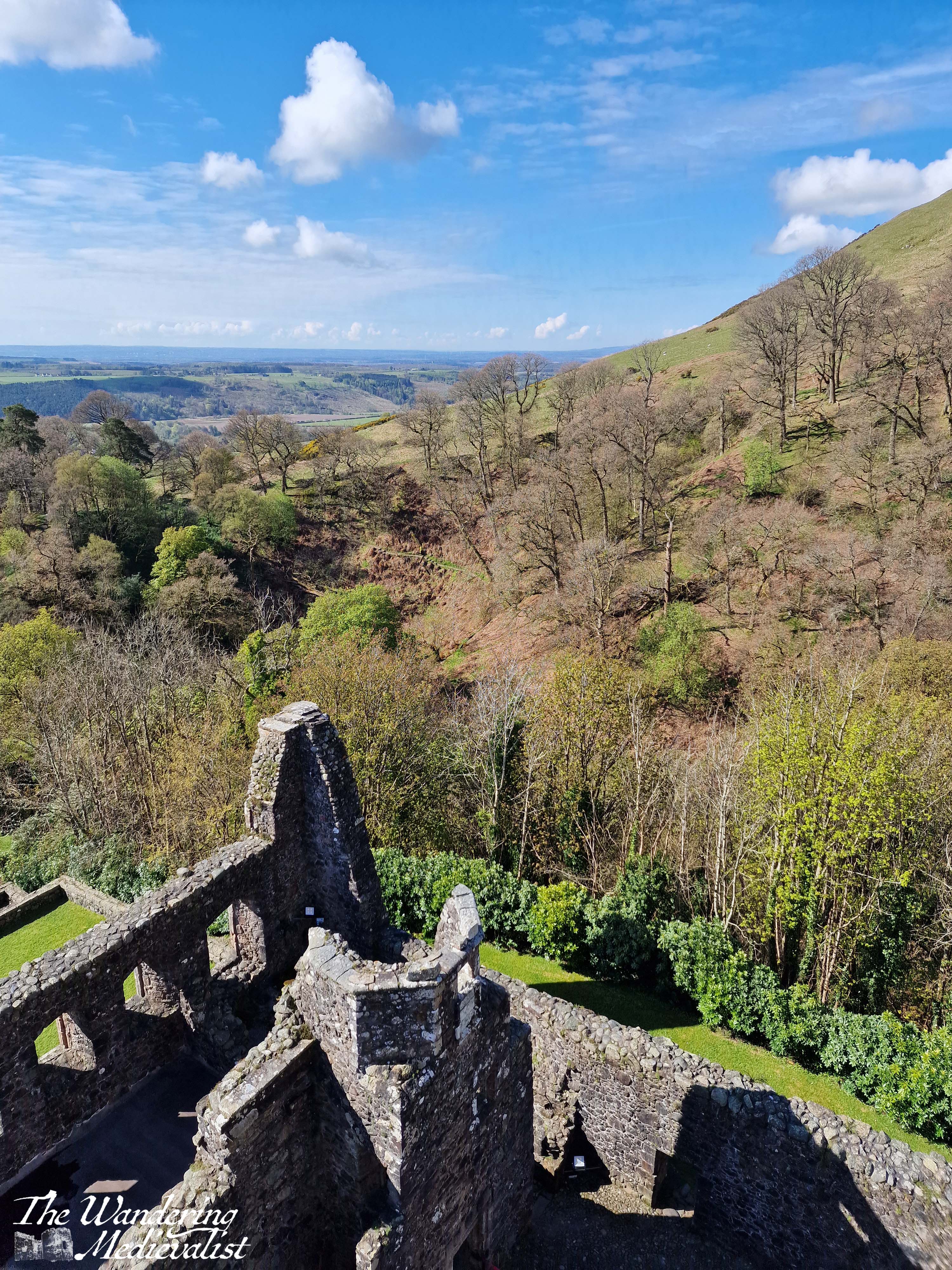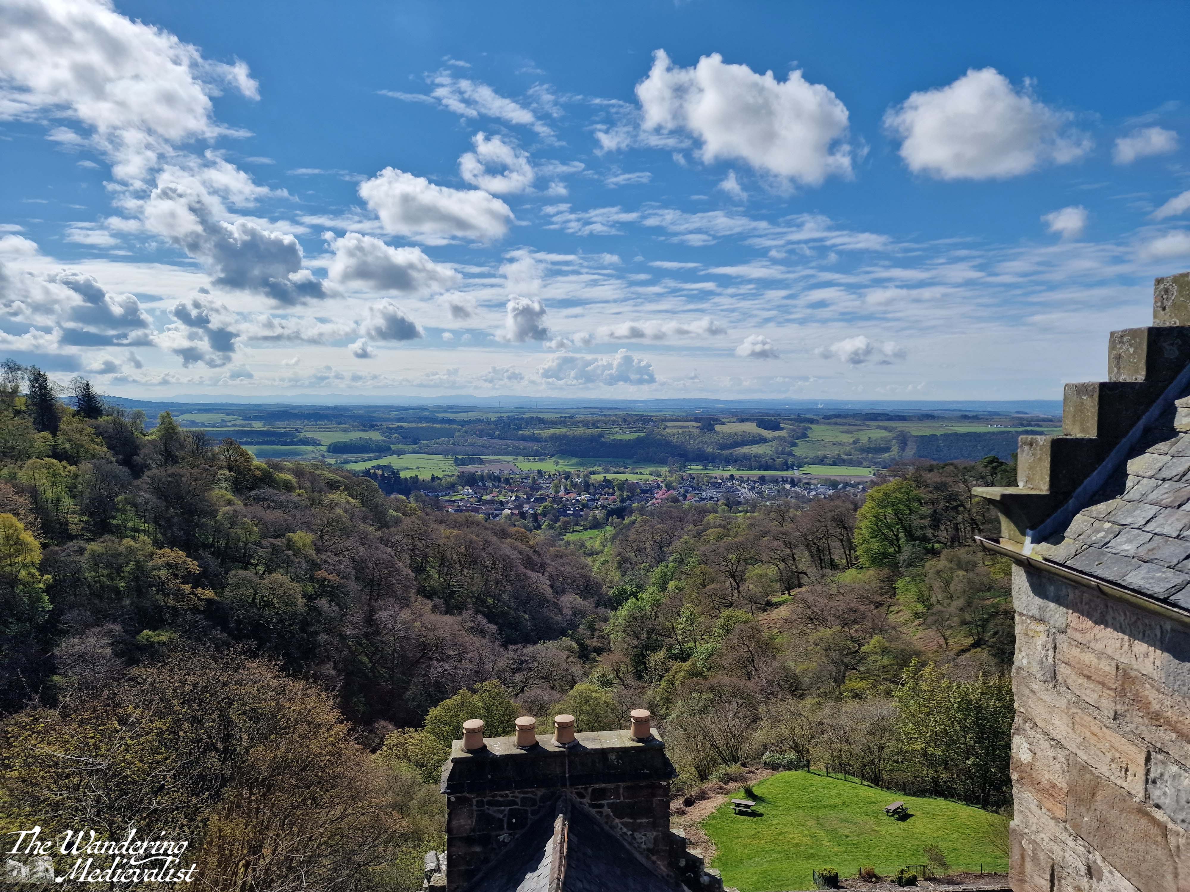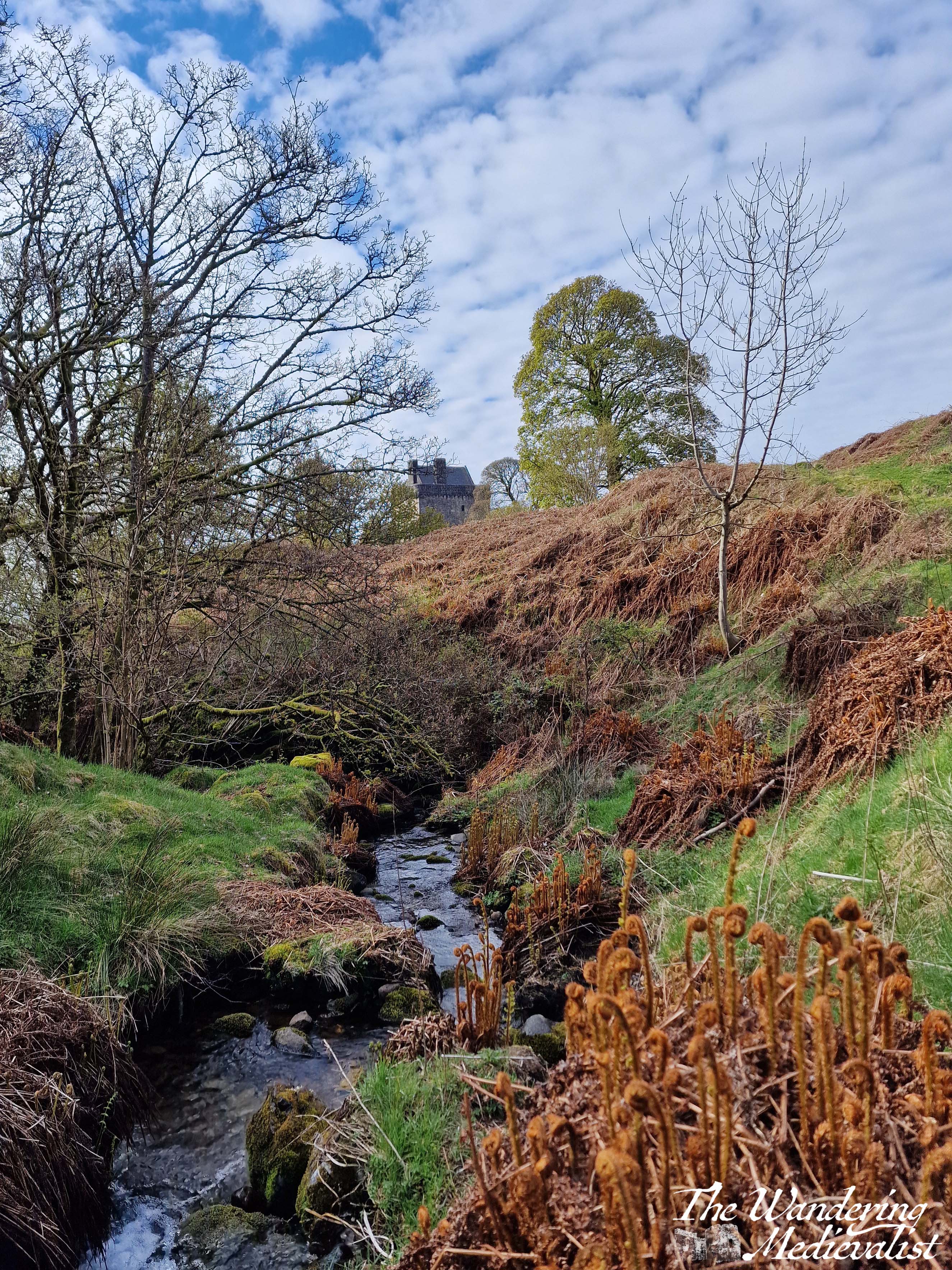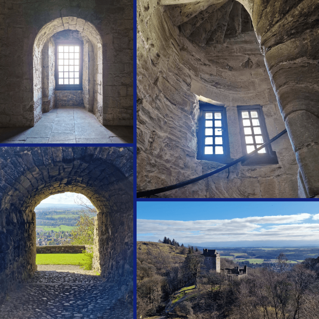 At the burn you can really see the castle rising out of the foliage, and so it gives one the energy to keep moving. Another up and down brings you to the main castle gate, which was closed for much of lockdown and only re-opened in April 2024. If you are feeling energetic, you can hike up behind the castle and follow a path into the hills, which I did just long enough to get another excellent picture or two; this is also the path to take if you wish to climb to the top of Bank Hill.