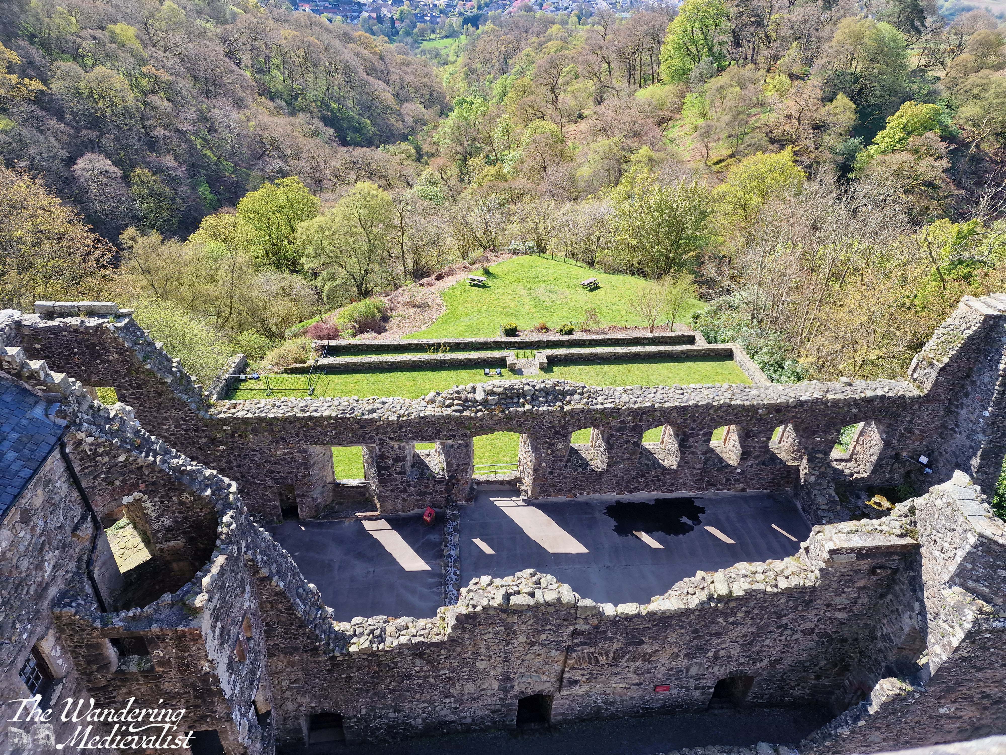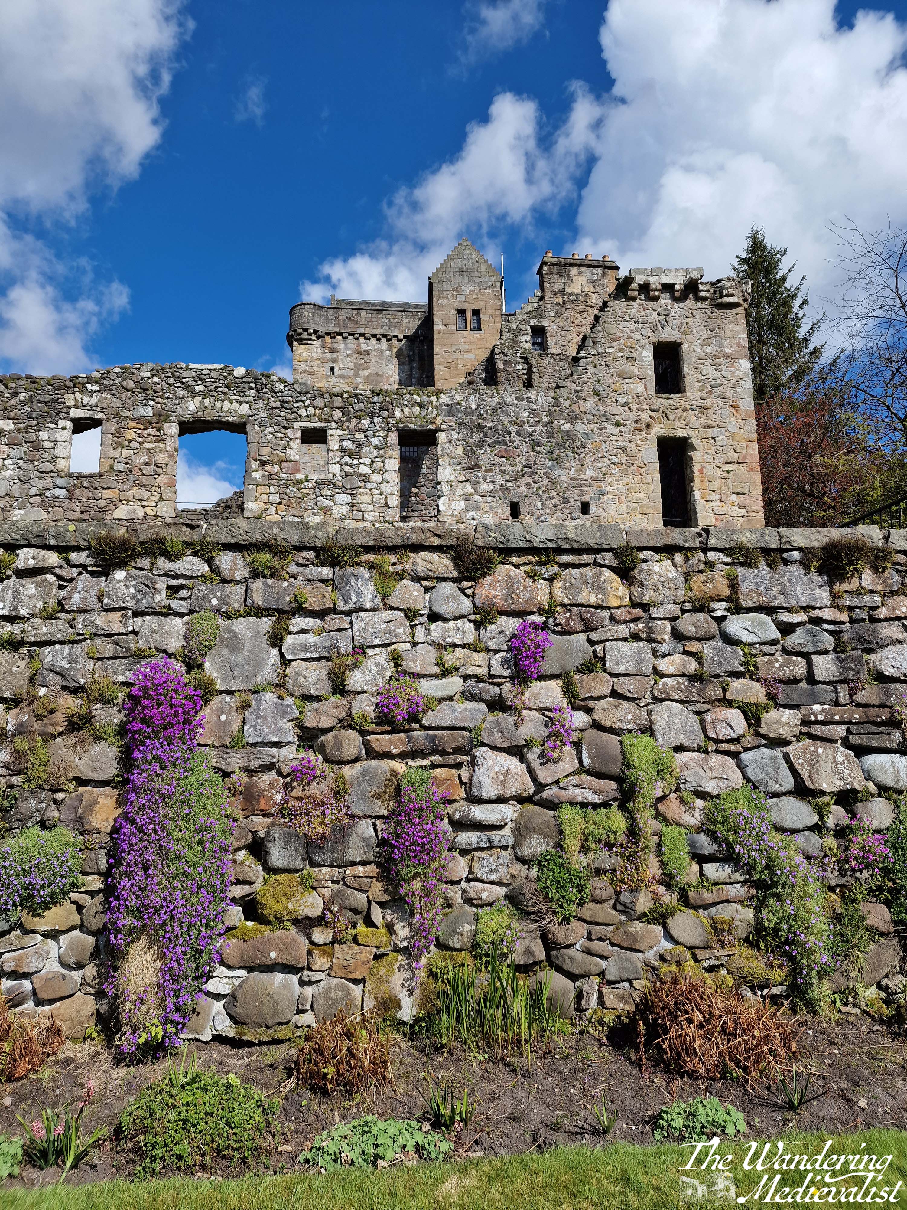 The newer parts of the castle, which are also those most in ruin, include two ways to get to the garden; one is out the side door, but the other is through a stone tunnel that emerges onto a grassy bank. The lower garden wall was all in purple when I last visited, and boasted views back up towards the main facade of the great hall, and the tower.