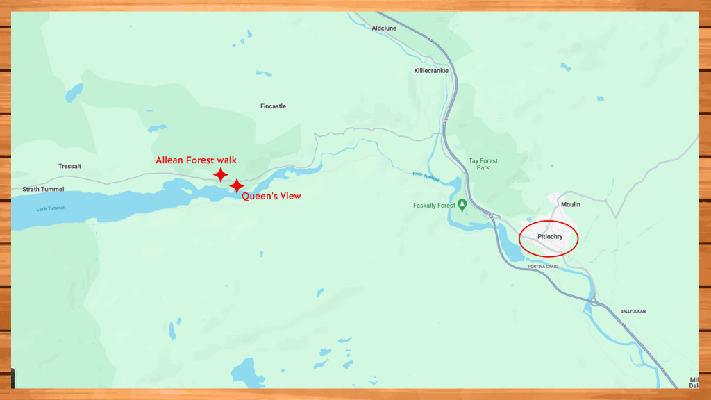 The advantage of Perthshire is that so much of it is just stunning, and easily reachable from Dundee, Edinburgh and Fife. Pitlochry, the nearest town to the Queen’s View, is less that two hours’ drive from Edinburgh or Stirling, and offers oodles of options for accommodation: guesthouses, B&Bs, lower cost hotels, luxury hotels, and a camping and caravan park. Pitlochry is a regularly-used base for exploring the area and only 14 minutes from the Queen’s View.