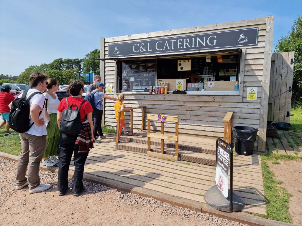 There is a good-sized car park with a porta-loo and a very good catering van that sells drinks, ice cream, chips and rolls with bacon, burgers, hot dogs, or haggis. There may have been a vegetarian option, but I am not positive.