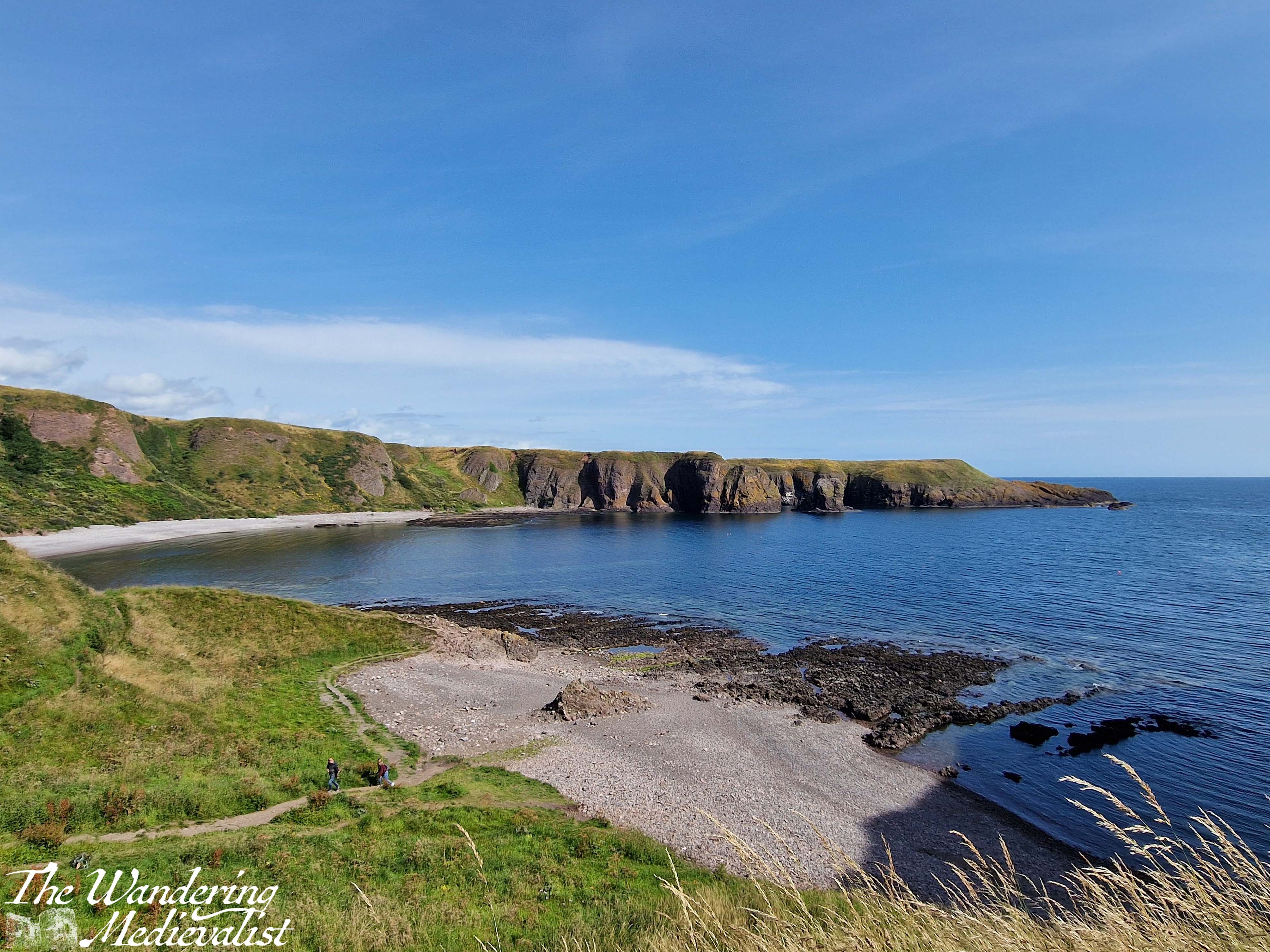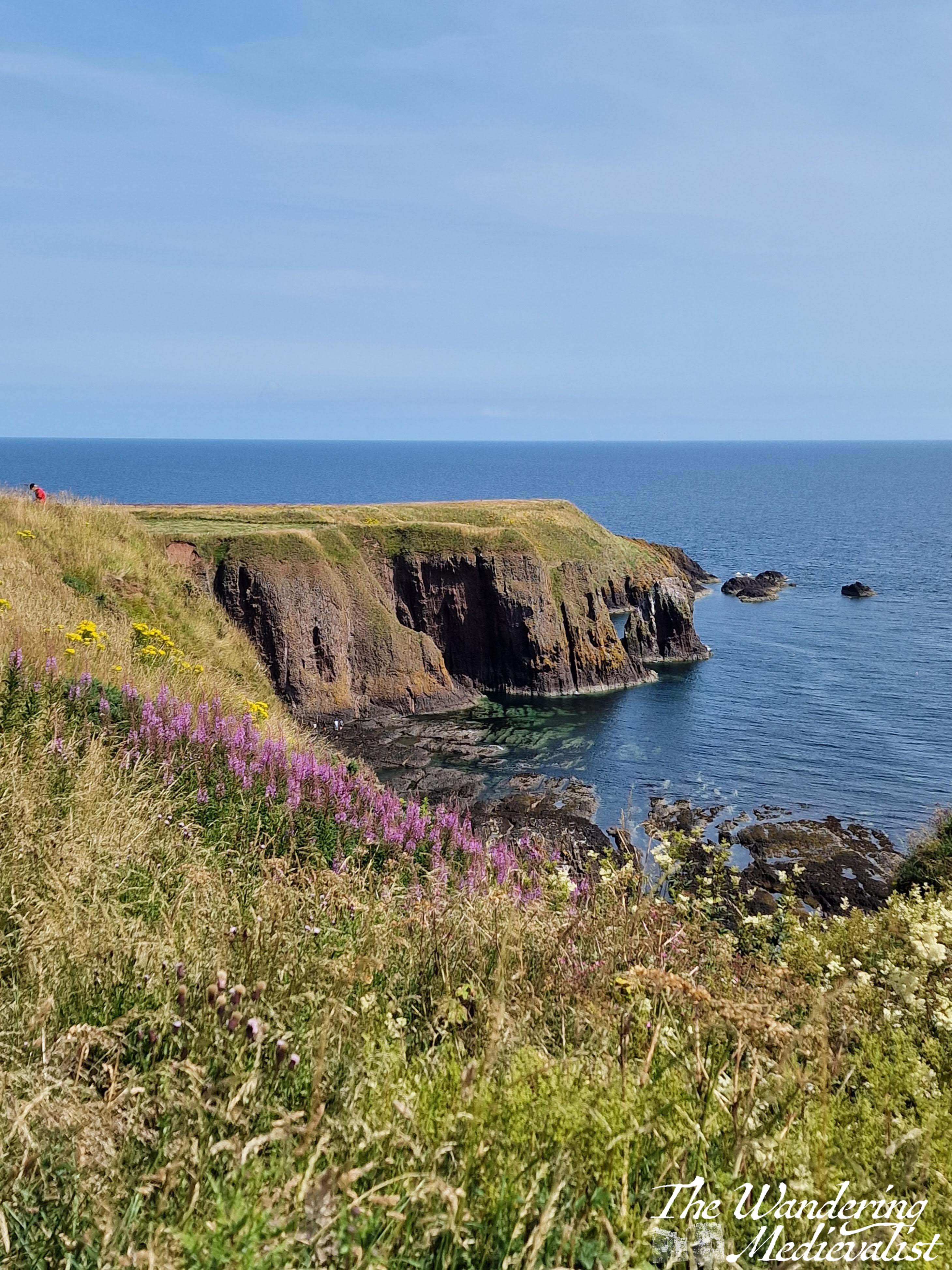 One has an option to go left along the coast, right across a few small bridges to a viewpoint, or immediately to the castle. I recommend, to get warmed up, a jaunt along to the right first, where you will go down and up a few sets of stairs and path as to move along the cliff. This path is also lined with Scottish fireweed (purple flowers) and gorse, and there are several excellent places to pause for a picture.