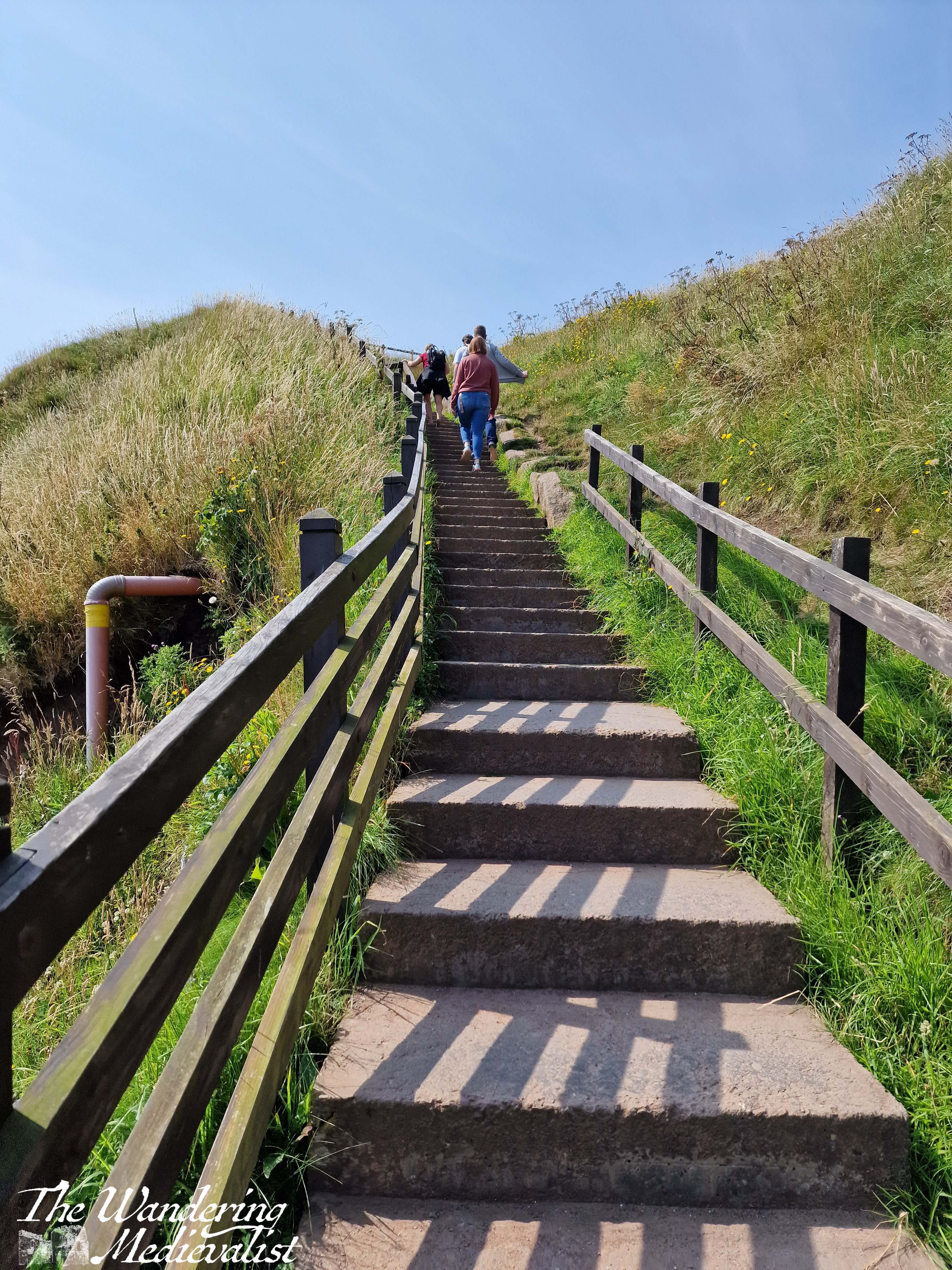 The bottom of the staircase offers again two options – you can scamper off left to explore the beach, or go straight ahead to the castle. Here one finds another set of stairs, though first you have a good view of the rock on which the castle is built, including a gated cave and the land bridge that once connected the castle to the coastline but was eroded for security.