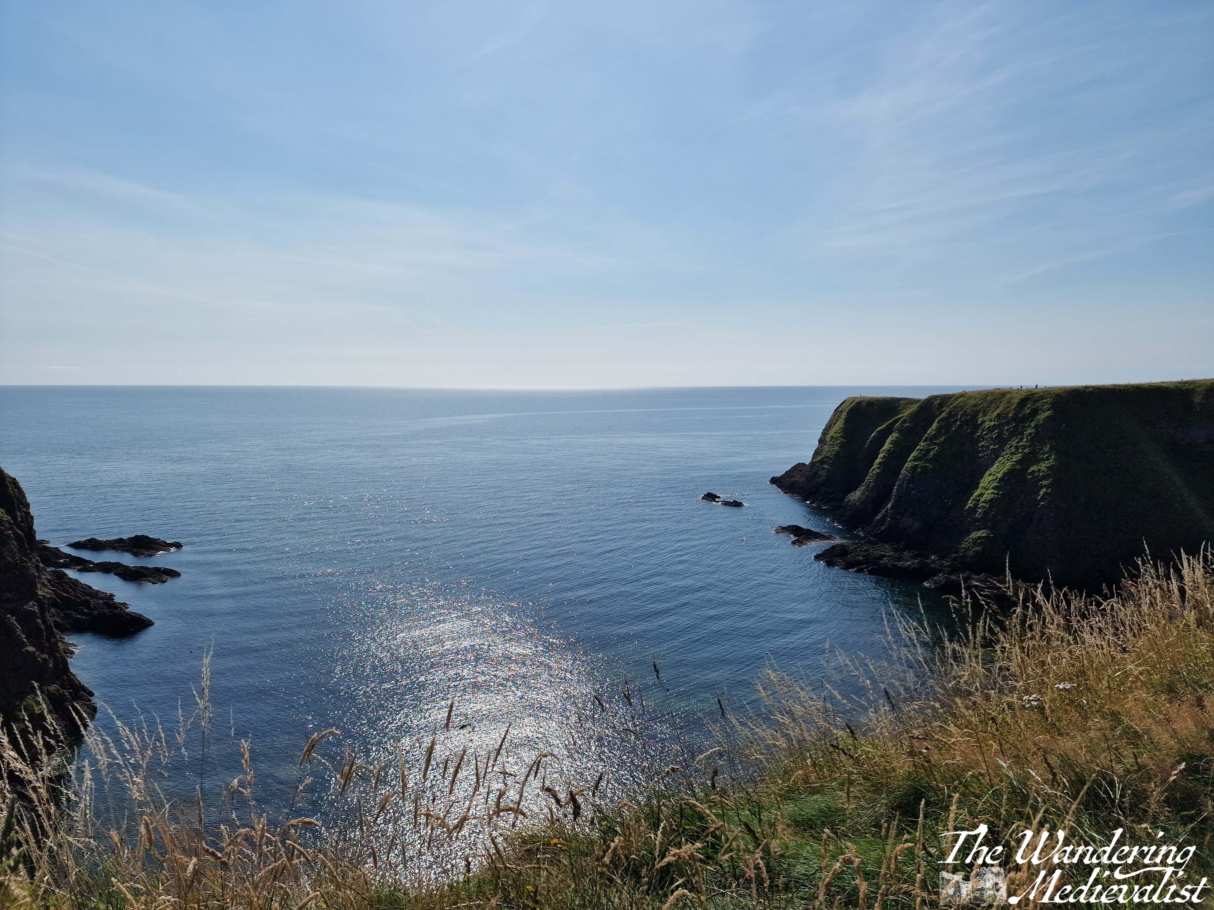 In all, you could easily spend several hours exploring the many nooks and crannies. The group I was with scattered to all corners of the castle, and it was lovely to sit in the sun and gradually wait for them all to drift back again, with various stories of things they had seen. Once we had traversed the stairs once more, we chose to walk along the cliff in the Stonehaven direction for about a mile, with the ocean and views of castle on one side and fields of cattle on the other.