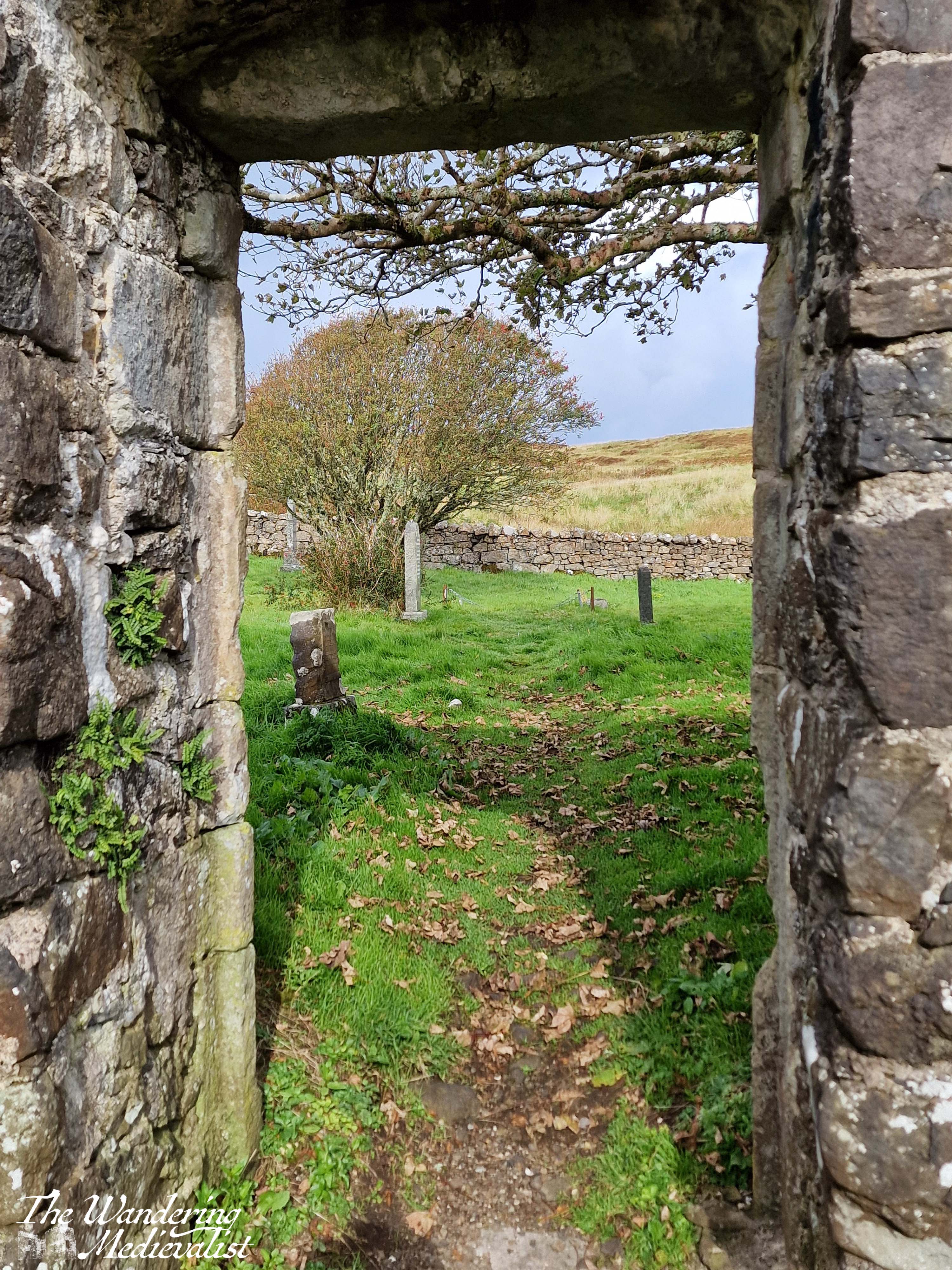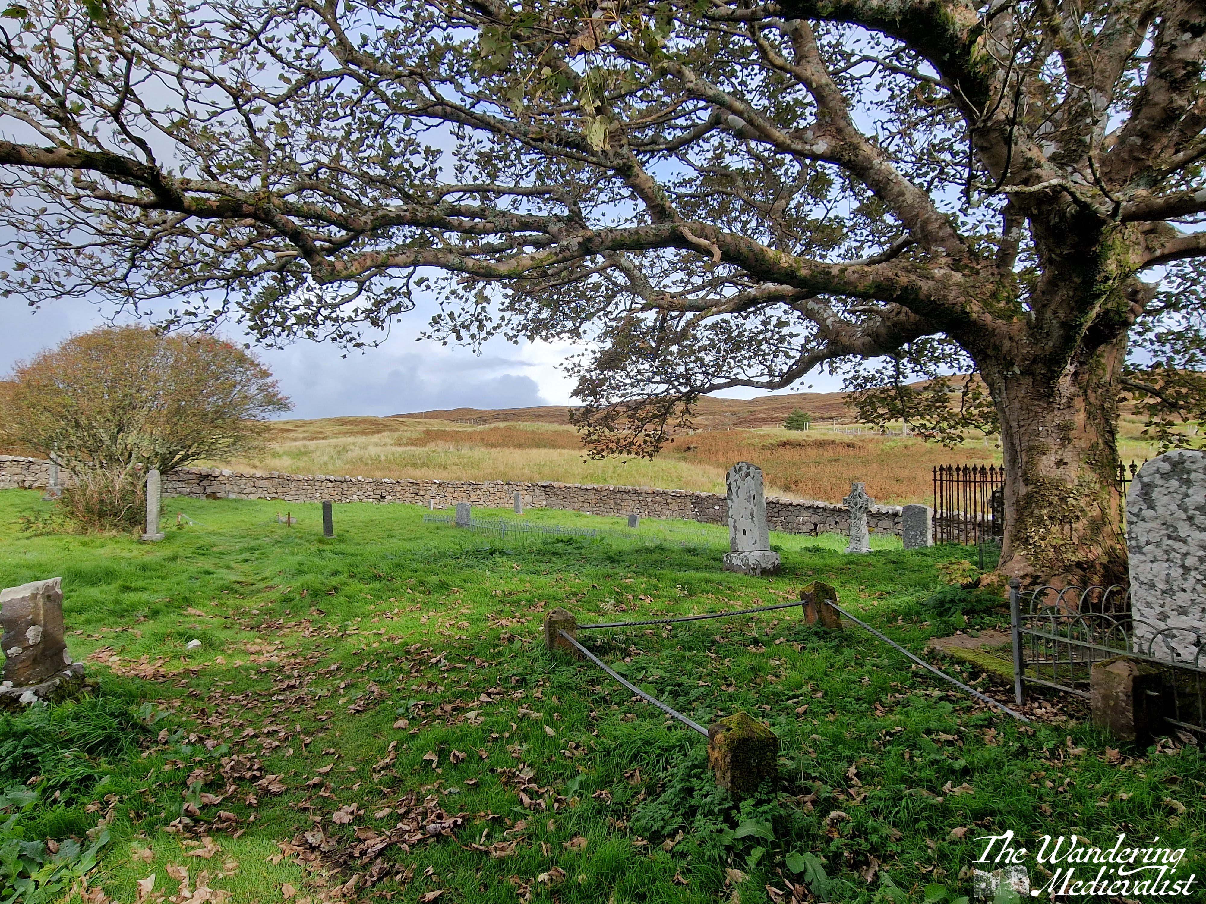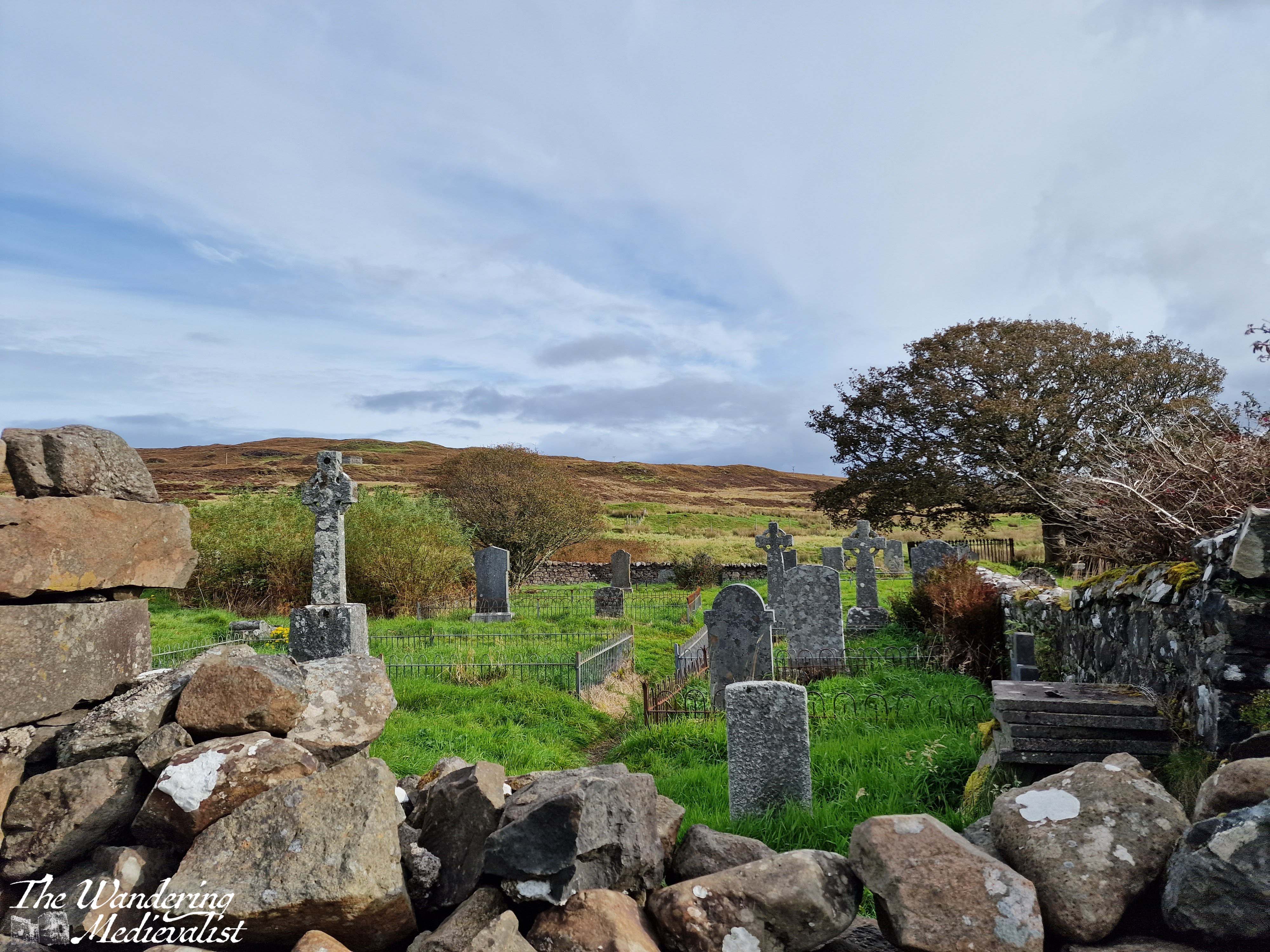 The trail follows the road up and around the corner to the left, returning to the lay-by. At this point, Dad and I decided we still wished to explore the church ruins and the standing stone on the top of the hill. We started in the church, which was likely to have been founded in the Middle Ages due to its alignment, though the parish dates to the post-reformation period. The stone enclosure of the site dates from the 1730s, and the church was the burial site for some Chiefs of Clan MacLeod as well as their hereditary pipers, the MacCrimmons. It is a beautiful ruin with lovely carvings in the nave, trees overlooking the now roof-less church, and graves of varying ages dotted around the property. It reminded me in some way of Old Burial Hill in Marblehead, though again that may just be my affinity for graveyards!