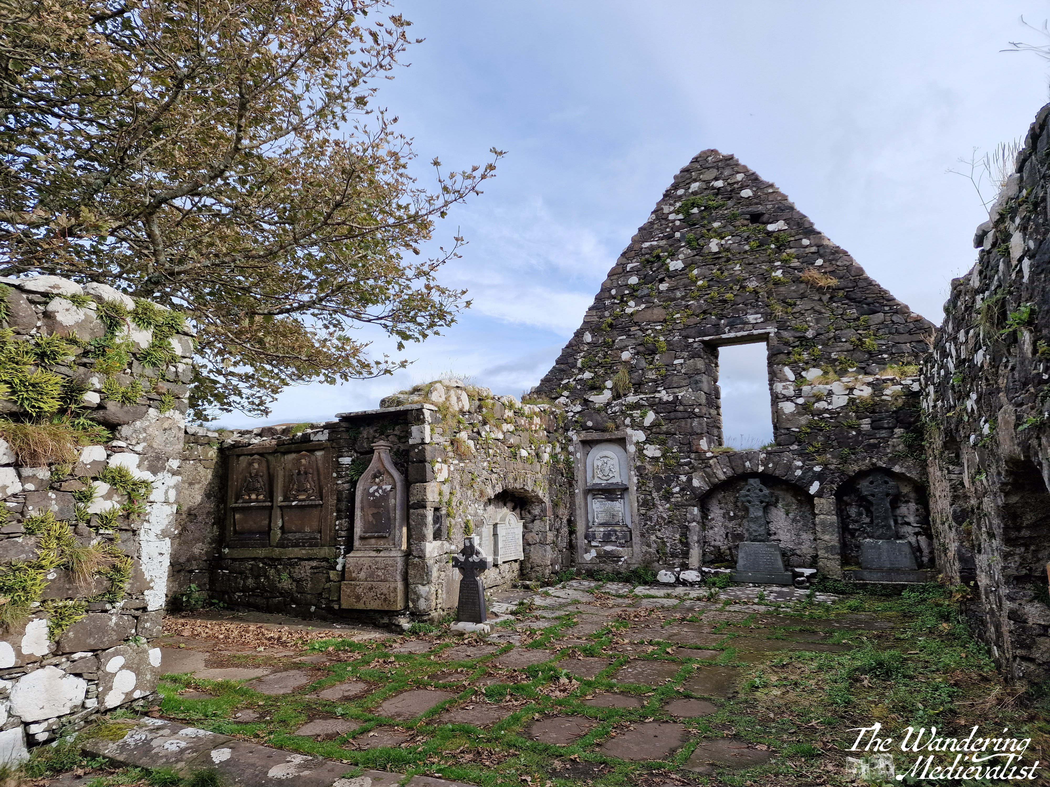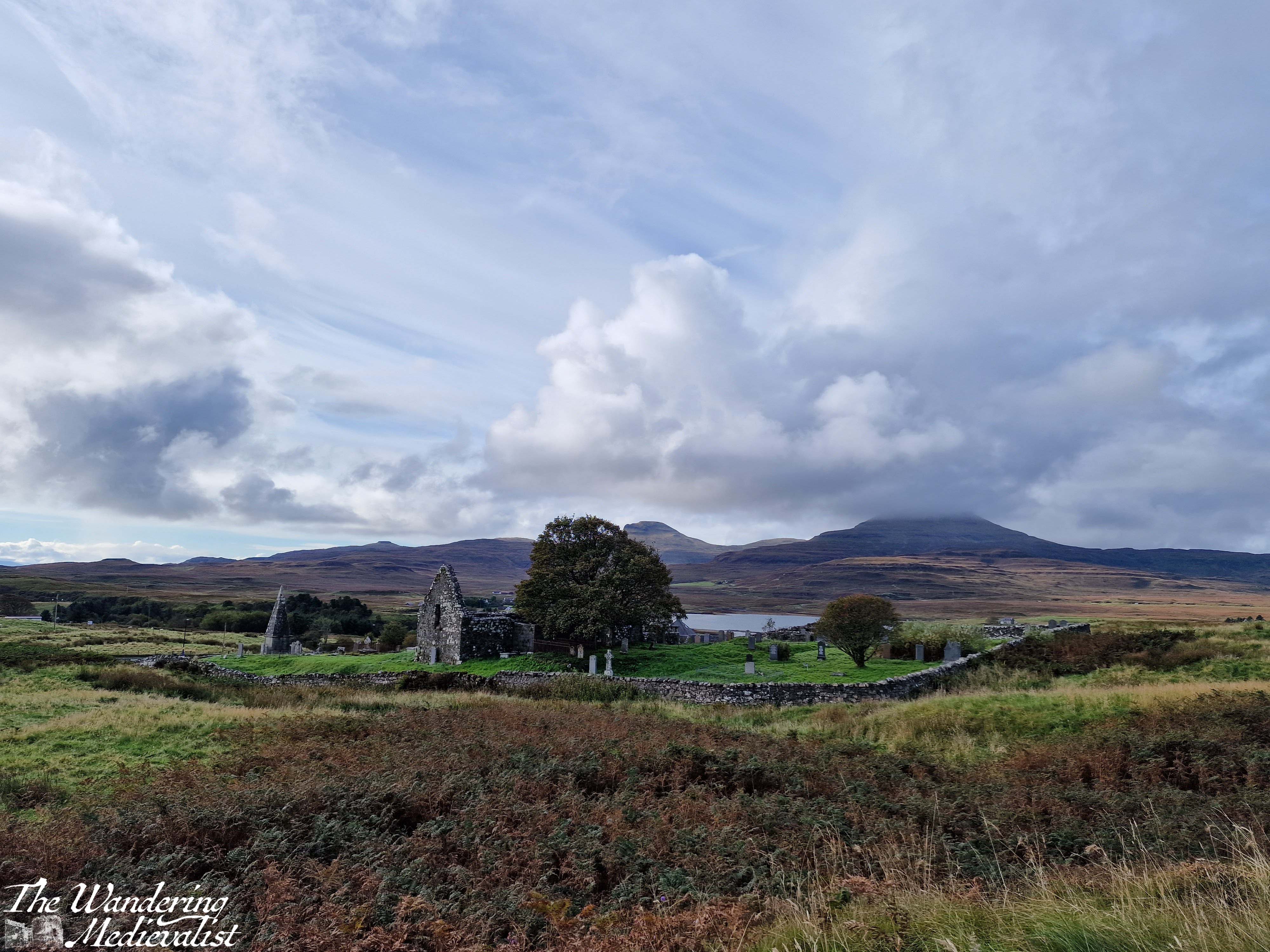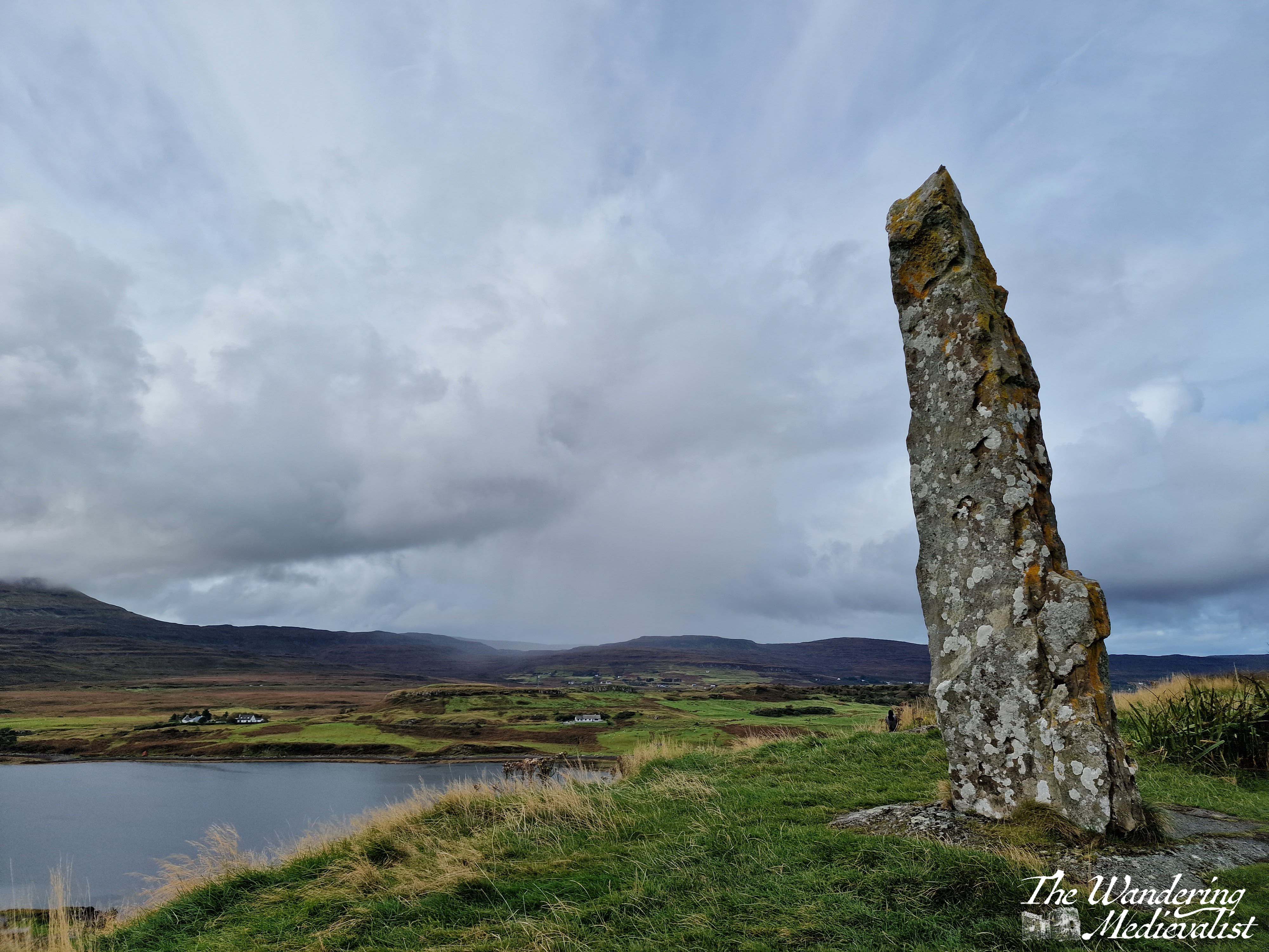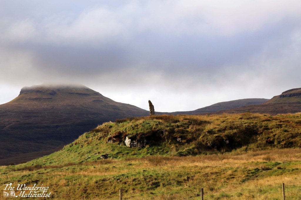 The trail follows the road up and around the corner to the left, returning to the lay-by. At this point, Dad and I decided we still wished to explore the church ruins and the standing stone on the top of the hill. We started in the church, which was likely to have been founded in the Middle Ages due to its alignment, though the parish dates to the post-reformation period. The stone enclosure of the site dates from the 1730s, and the church was the burial site for some Chiefs of Clan MacLeod as well as their hereditary pipers, the MacCrimmons. It is a beautiful ruin with lovely carvings in the nave, trees overlooking the now roof-less church, and graves of varying ages dotted around the property. It reminded me in some way of Old Burial Hill in Marblehead, though again that may just be my affinity for graveyards!