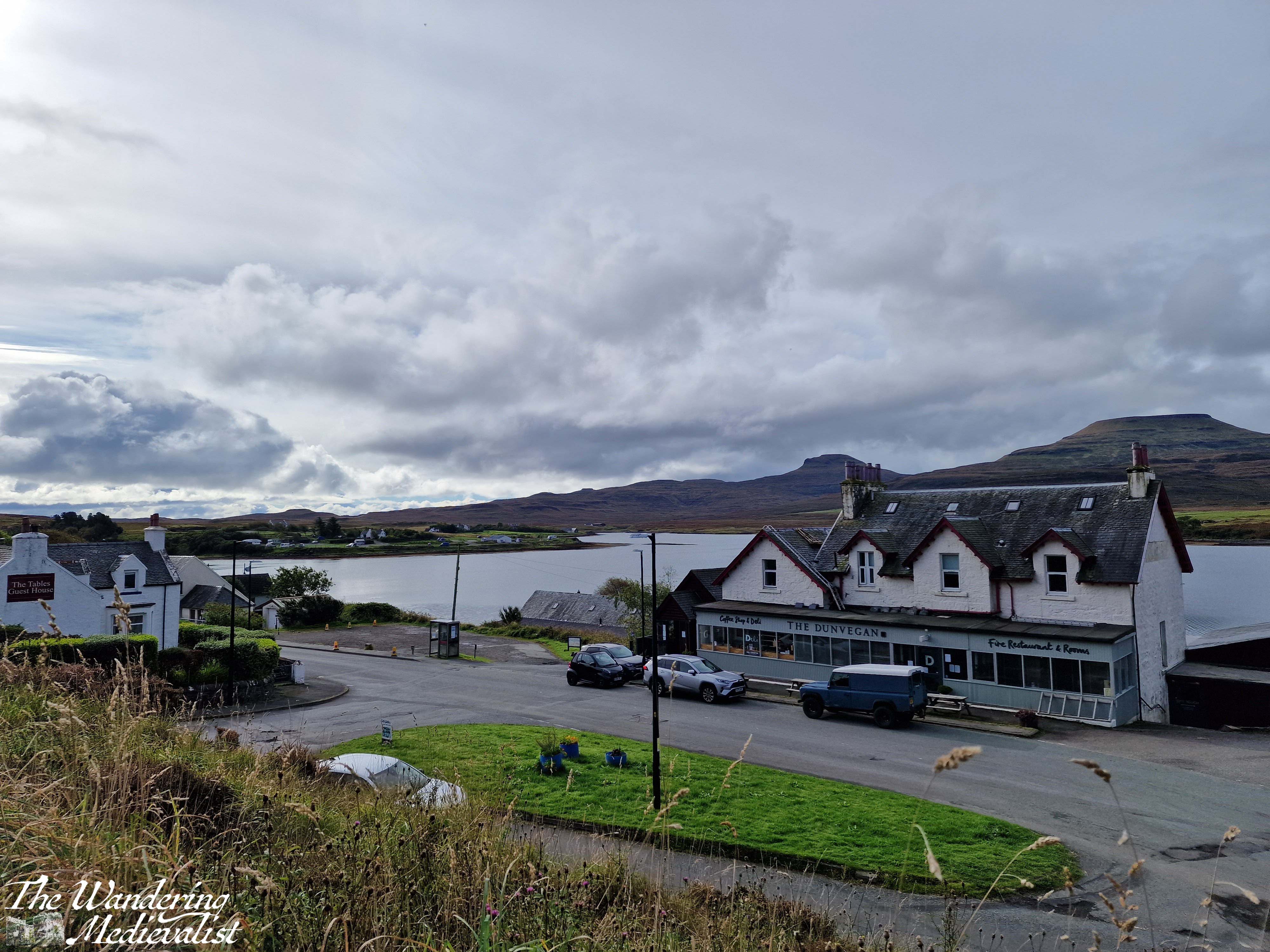 Upon returning to the car, we both felt the need of refreshment after our roughly two-hour walk and exploration of the church and hill. Fortunately, the town has several options for food and we stopped into the Dunvegan Deli and Café, where I had purchased a few extra snacks on our previous visit. The café does not offer lunch but does sell coffee, tea and an impressive array of excellent cakes. The tables overlook the loch, and it was a very pleasant place to sit with a cuppa to relax. It was also the perfect spot to pick up some dinner supplies: pasta, sauce, and a delicious local cheese, plus of course another cake for dessert. Their range of food includes crackers, jams and jellies, Highland honey, cheese and some cured meats, local ale, and much more!