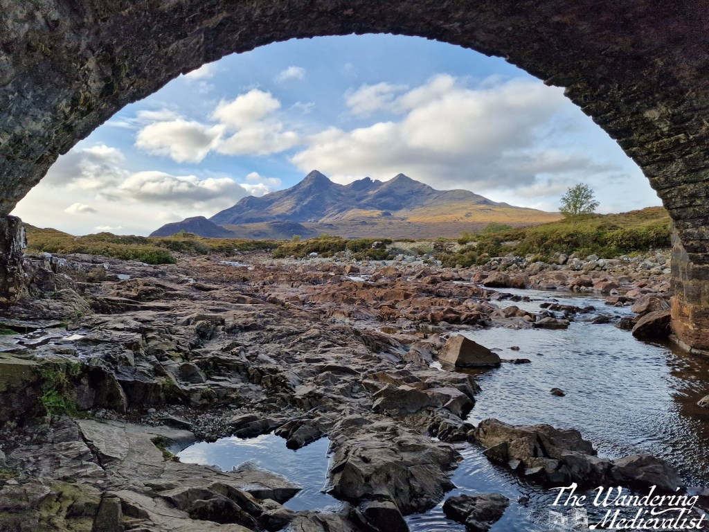 That said, the day we started our drive home was sunny and gorgeous, so I could not resist a stop at Sligachan Bridge, which had been overcast on our last visit. I pride myself on staying dry while managing this under-the-bridge picture of the distant Cuillins.