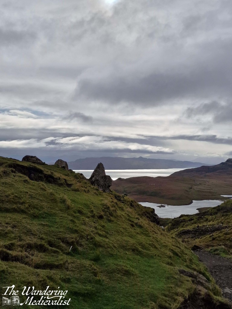It is always nice when the sky is blue, but the Highlands lend themselves just as well to clouds and partial sun. I loved this view of rocks, loch, hills and ocean beyond.