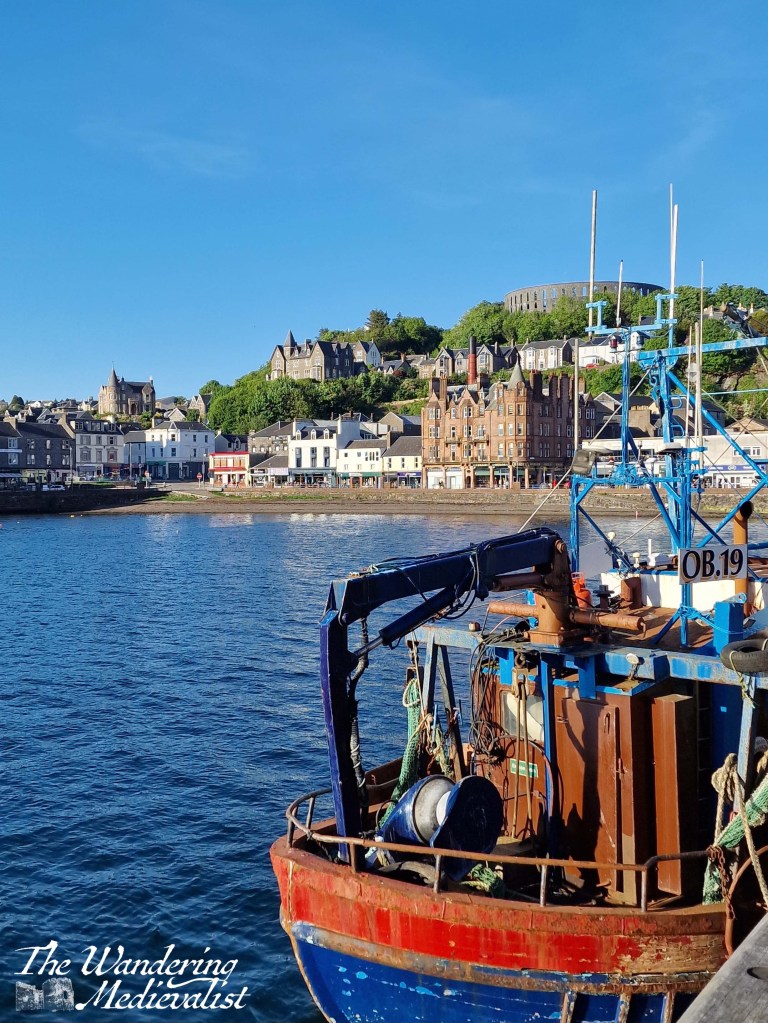 We had a near perfect day in Oban when we first arrived – stunning blue sky and bright sun. This picture seems to cover it all – the monument on the hill, the harbour and the distillery and high street.