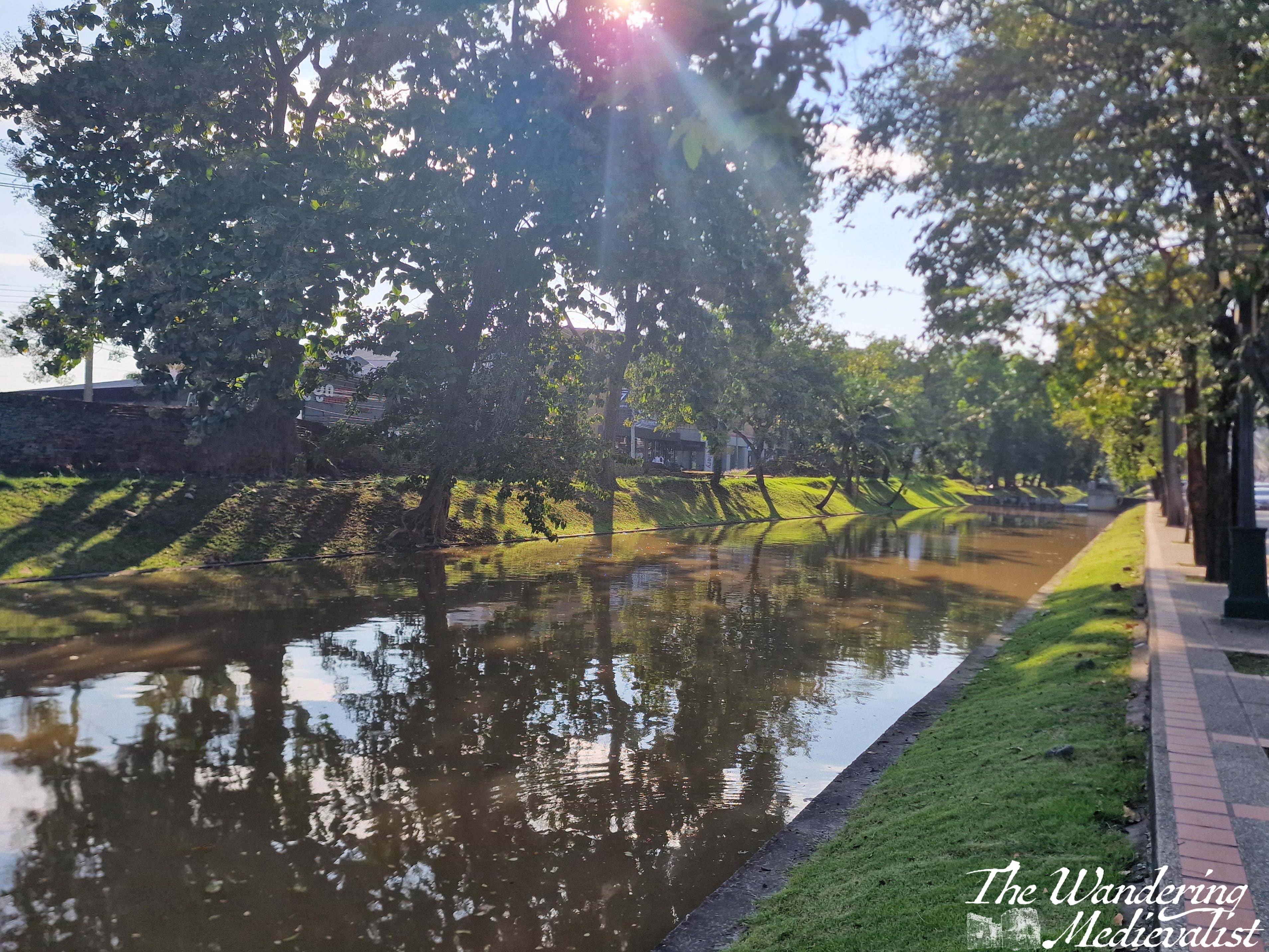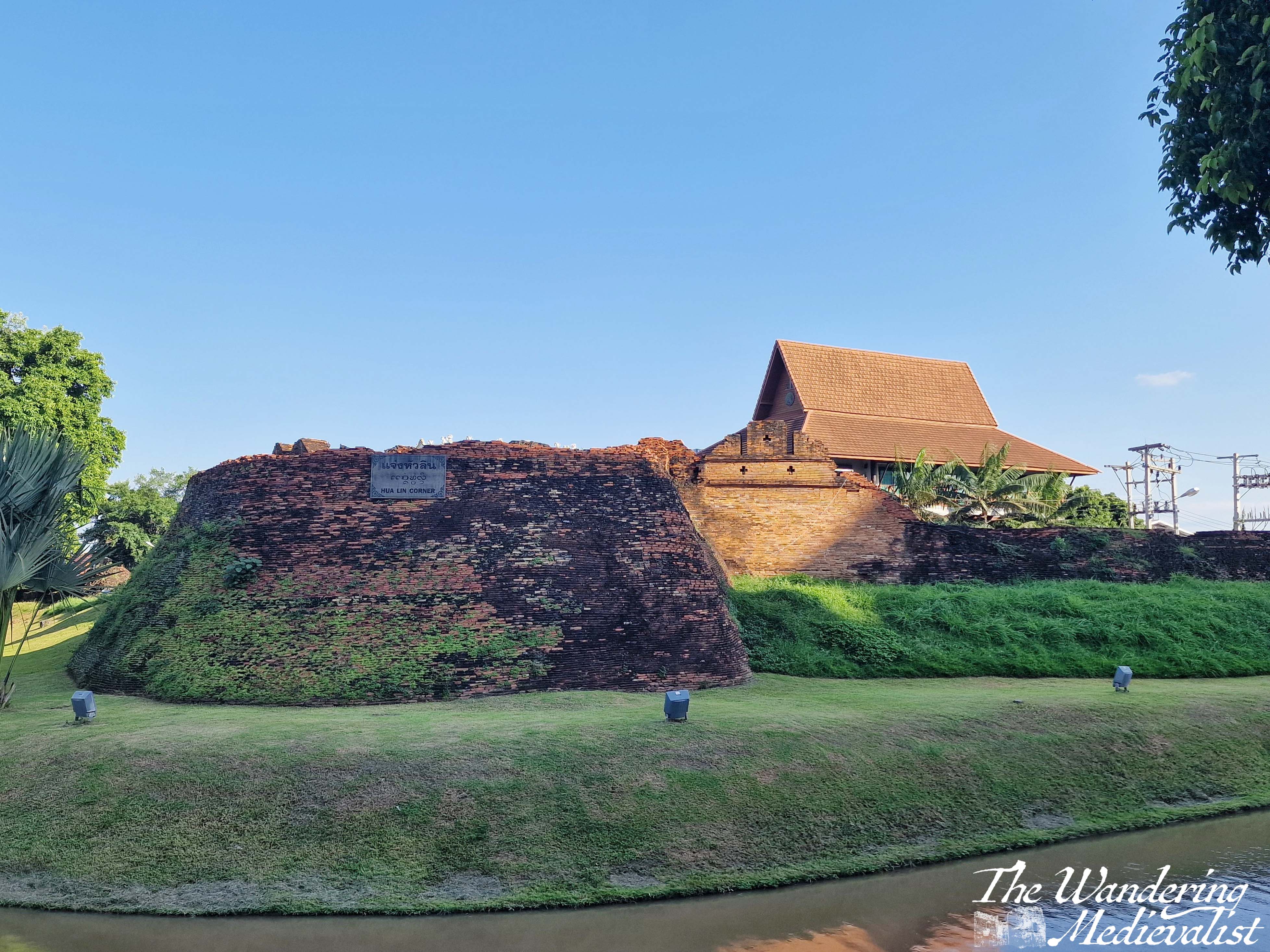 The corner, which I reached after 5-10 minutes of trying to resist taking pictures of the moat, is called Hua Lin corner. It is the location of a former aqueduct, bringing water from the Huai Kaeo brook over the moat and into the city. Today, there is a small garden and some seats where one can rest briefly, and look across the water at the remains of the city wall and bastion.