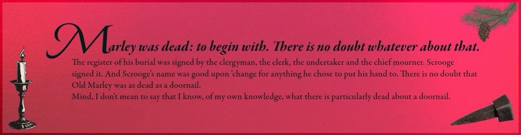 Perhaps most of all, I love his ability to forget the formality of writing and to speak to us as equals, as if we are in the room with him. He seeks confirmation from us as to the wisdom of a simile (what is there particularly dead about a doornail?), and ensures that we understand the significance of his choices. He wants us to know that he spent a great deal of time clarifying Marley’s deceased state because it is vital.