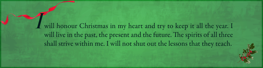 It is not just the richness of the writing that I love – it is also the value of the story. It is more than just a wealthy, miserly man learning to give back; rather, it is also a tale of self-reflection. Few are as capable of harshly judging a person as that person himself or herself – throughout Stave (Chapter) One, it is evident that Scrooge knows perfectly well that people do not like him. He is happy with this, prefers it that way. It is only once he sees the impact he has had on others, the tragedies of his own life and the potential tragedies of those around him, that he can reflect back upon himself and realise he does not wish to be this way. He has made his own choices in life, he owns them, and decides to change his ways. It is a heroic and not easy thing to do. In his confrontation with the final spirit it is clear that just a desire to change may not be enough to save him, even has he beings to stammer his life-altering promise, that is also begging for another chance.