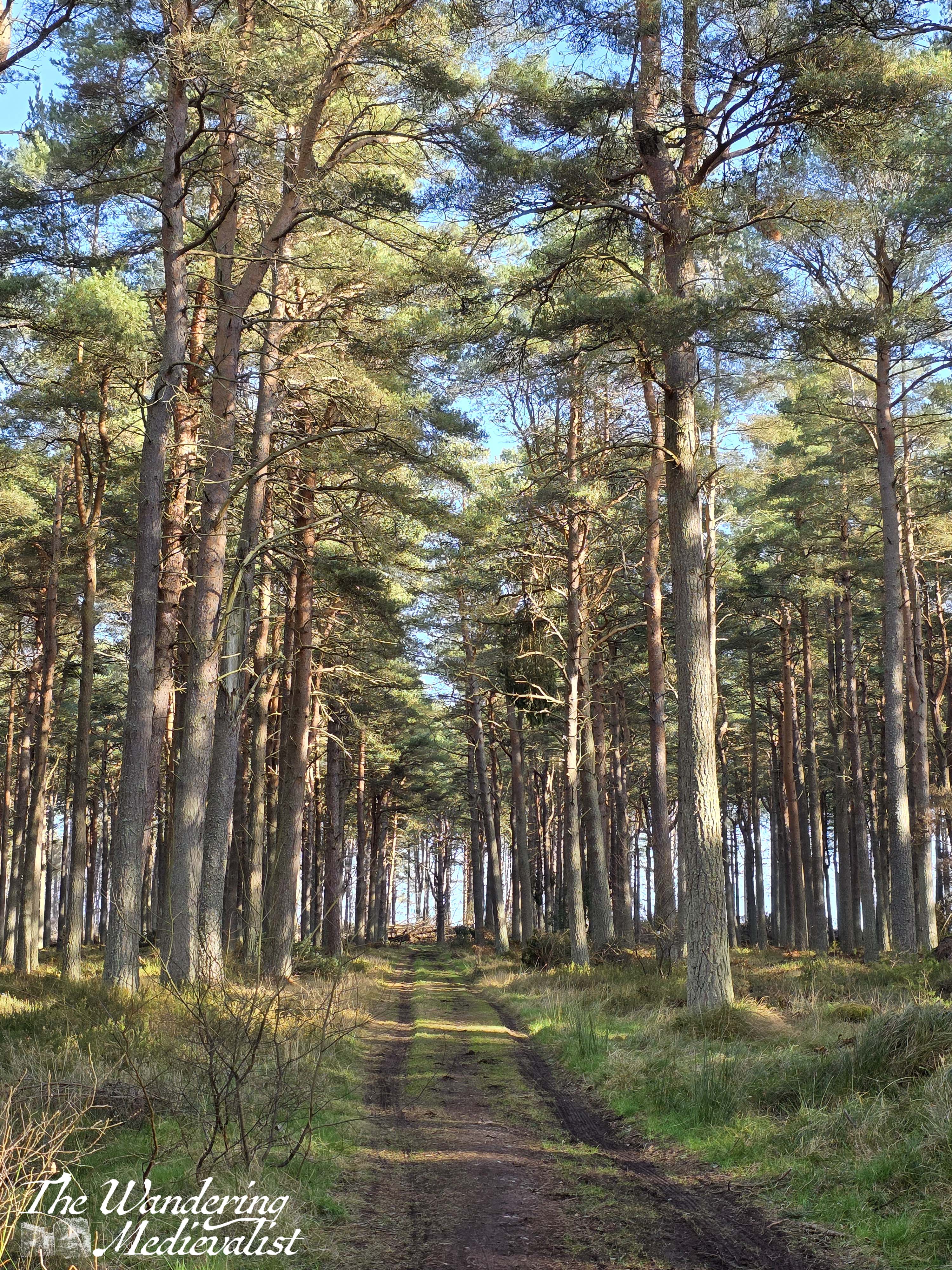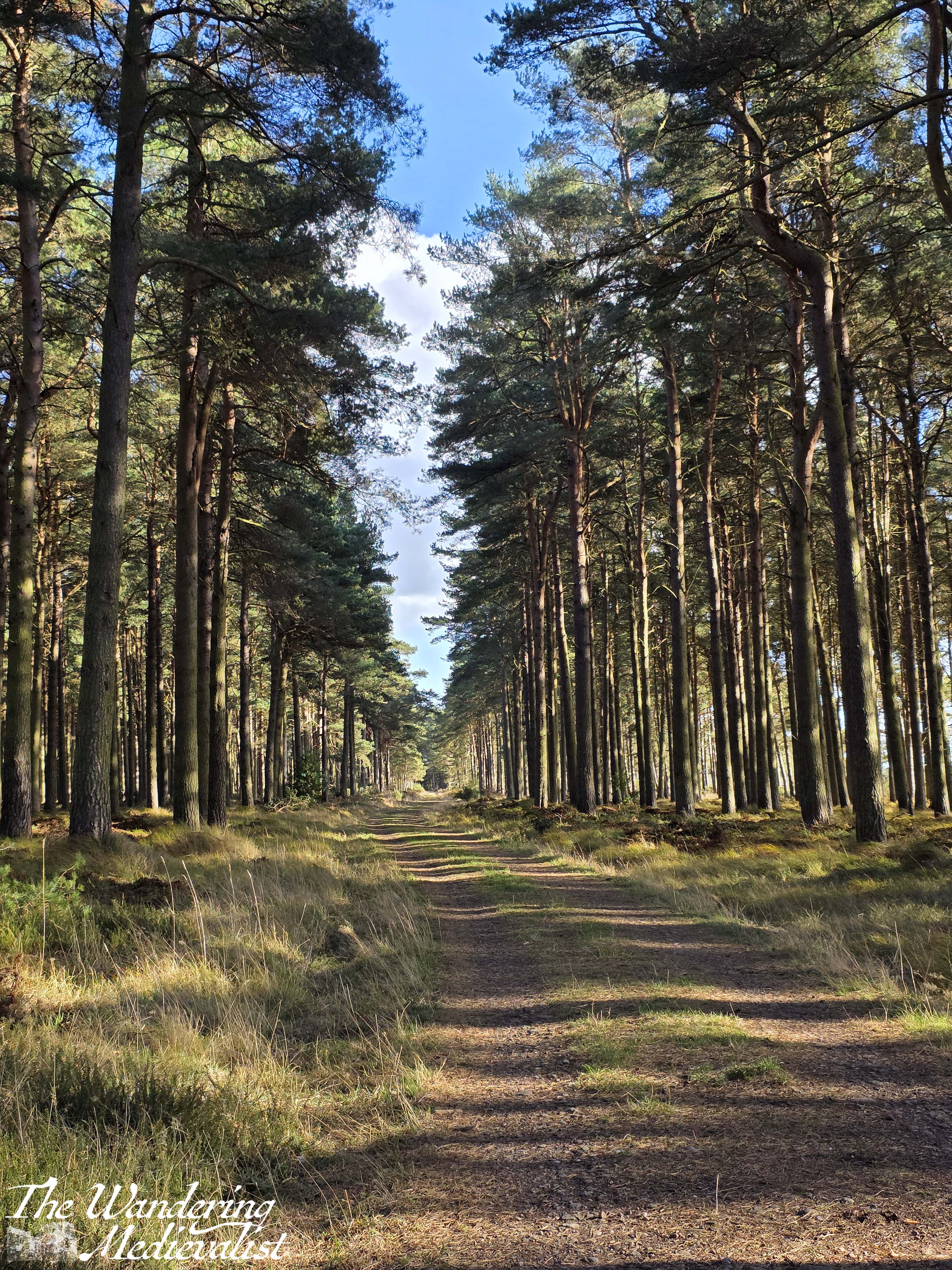 The path skirts past a large radio tower and I started to wonder if I was lost when finally the sign appeared on a gate, directing off of the road and onto a wide farm track. This track curves several times through a beautiful stand of silver birch, passing fields of horses on the left, before going through another gate and entering the stands of tall pines.