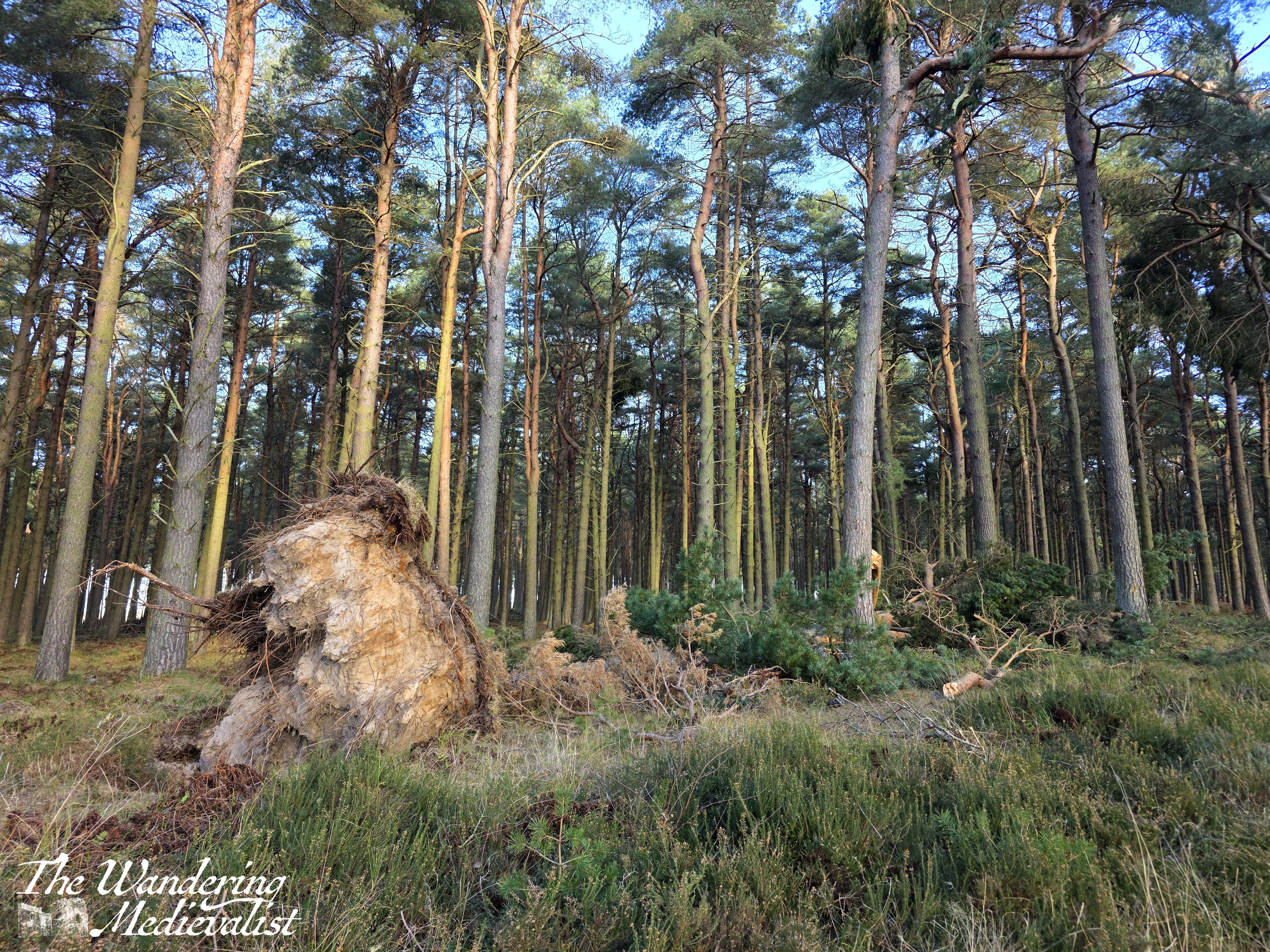 Storm damage became more and more evident as I walked, though I also noted that this would be a stunning walk at a time of year when the heather was blooming, as it carpeted the edge of the tree line and the forest floor. This stretch through the trees was a bit longer than I expected, and then just as I wondered if I was stuck forever in the forest tunnel, I realised that behind the distant trees was the blue of the open sky. Patches of sand interrupted the dirt trail, and many more fallen trees were stacked in piles – all signs of the approaching open coastline.