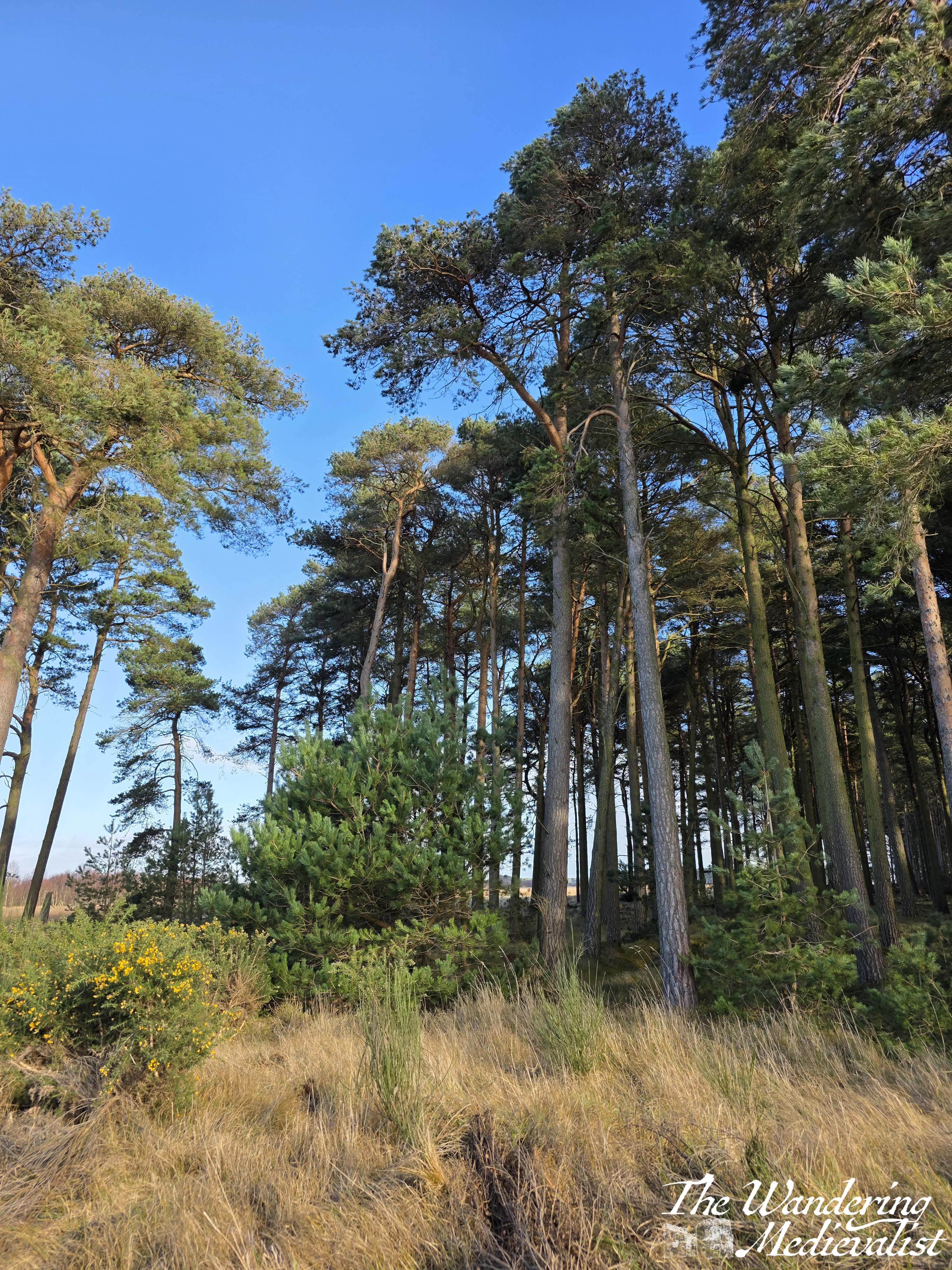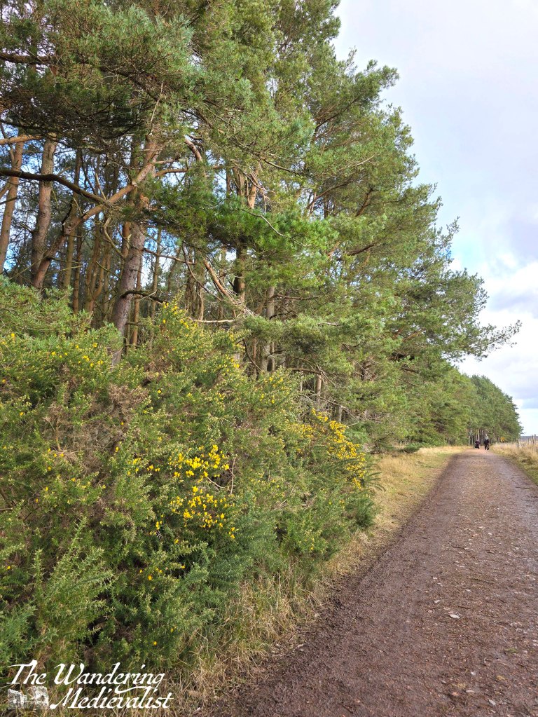 The path is straight here, with fields on one side and tall pines with underbrush of gorse along the other. I can see the appeal of doing this walk at a time of year when bugs are minimal as there are some pools of standing water and animals in the fields. I am quite allergic to gorse so was relieved to see it only just starting to flower – granted earlier in the year than I might have expected. I was making good time here, and I think it was at least partly due to my racing against the approaching rain.