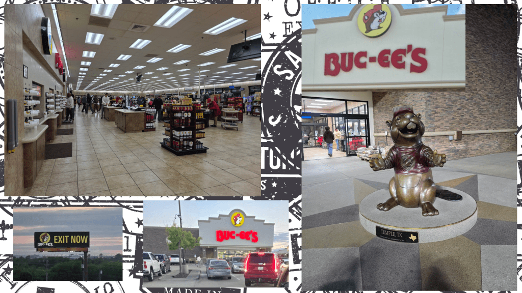 Another Texas institution that we were required to visit, particularly on our drive, was Buc-ees, the most incredible rest stop I have ever seen. The appeal is multi-faceted: the restrooms are clean and many; there is parking and gas pumps enough for 18-wheelers and plenty of cars; there is an impressive line of soda dispensers in numerous different home-made flavours; and when it comes to shopping, where to begin? They have standard car snacks like crisps, nuts, candy; jerky in numerous flavours; a bakery; a fudge stand; every refrigerated drink you could want; sandwiches; fresh fruit; a pulled-pork BBQ stand; sauces and spices; car supplies like window wash; Buc-cee’s and Texas merch – and so much more I have forgotten.