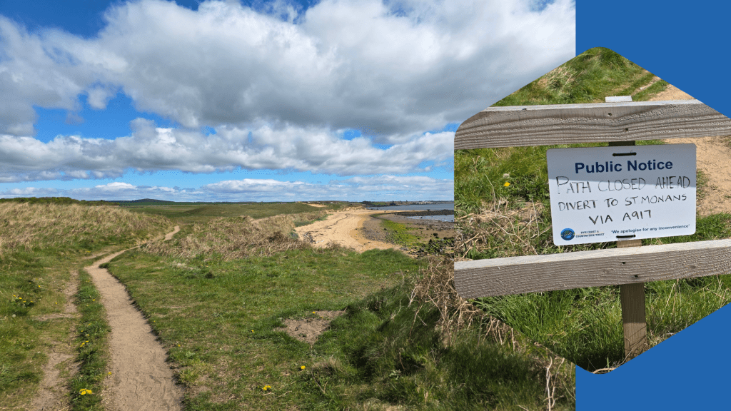 Turning left, I had walked only a few moments when I realised that the way was blocked by a wooden gate and sign: Path closed ahead, divert to St Monans via A917.