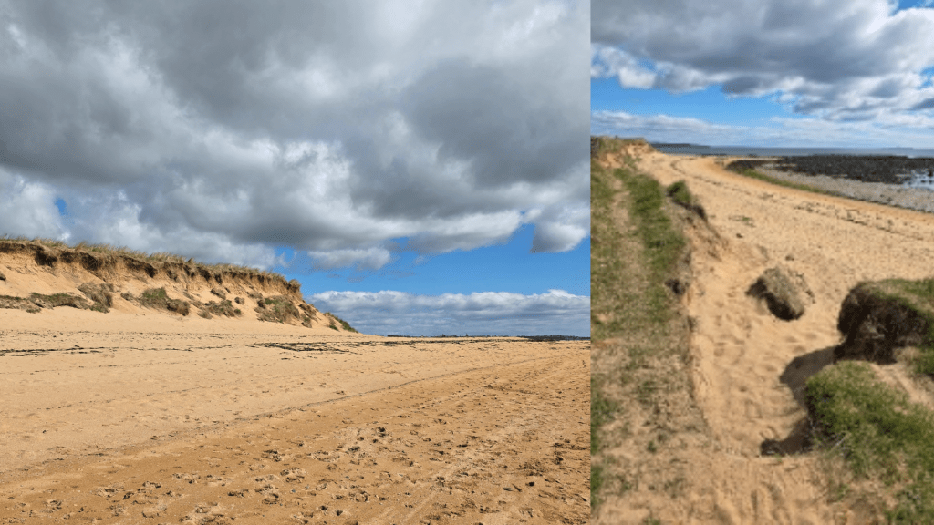 I have to admit to letting out a string of curses. How could I be in this situation again (see my issues walking Leuchars to Tentsmuir)? Had I wasted another valuable Saturday? I hummed and hawed a bit, thinking about going back to the road or possibly trying a walk in the other direction. That section of the path is longer than I was willing to try on this occasion, however, so after seeing several groups head down to the beach, I decided at least to get a beach walk in and see how it went. So, after skirting around the fence, I followed the trail until it disappeared into erosion, at which point I hopped down a steep decline to the beach.