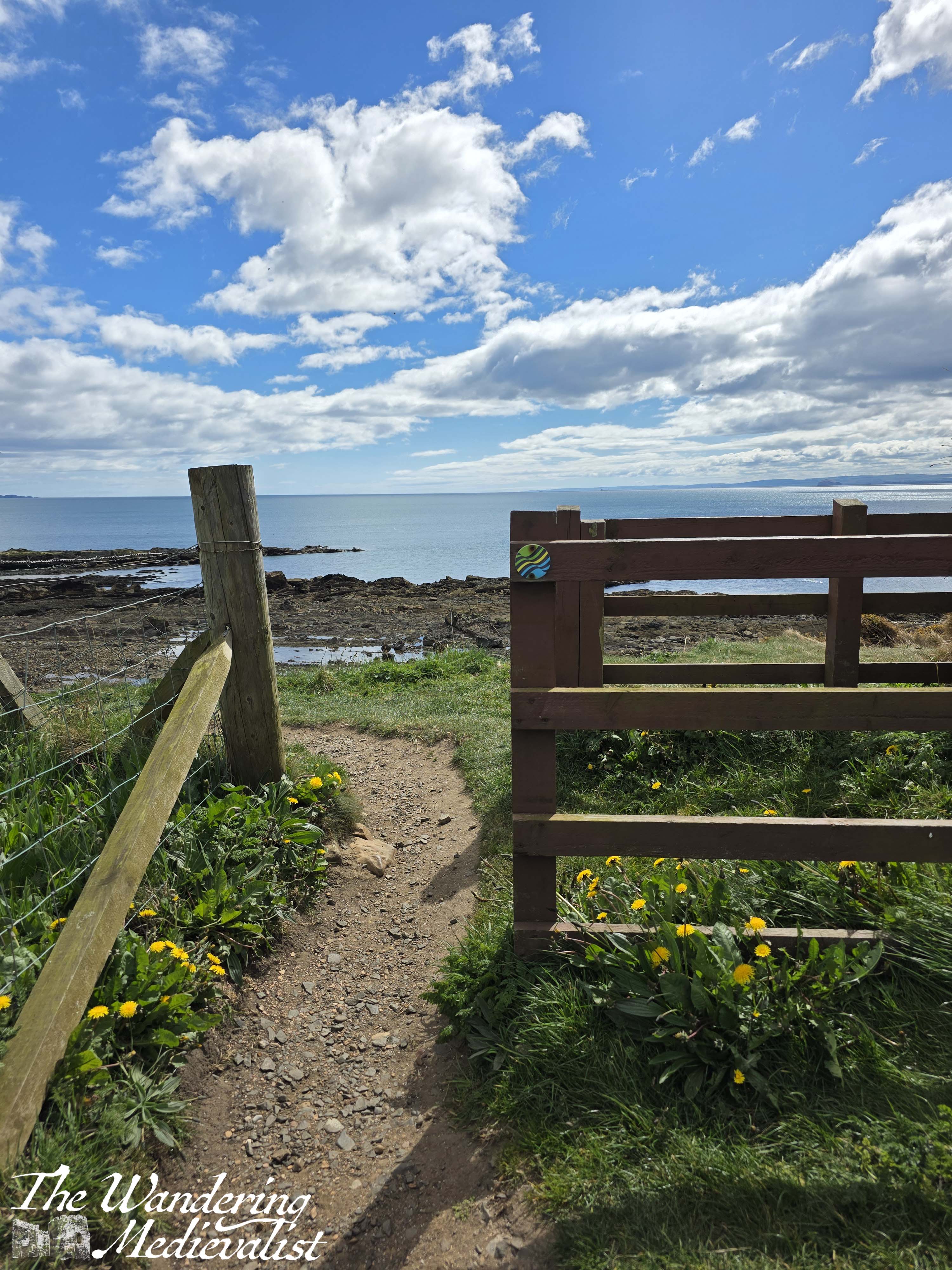 There is a large noticeboard bearing information about the trail, and then the path leads forward through the grass. The main route appears to take a circular route around the slight hill, leading walkers to the Lady’s Tower, now not much more than a hollow arch on the coastline.