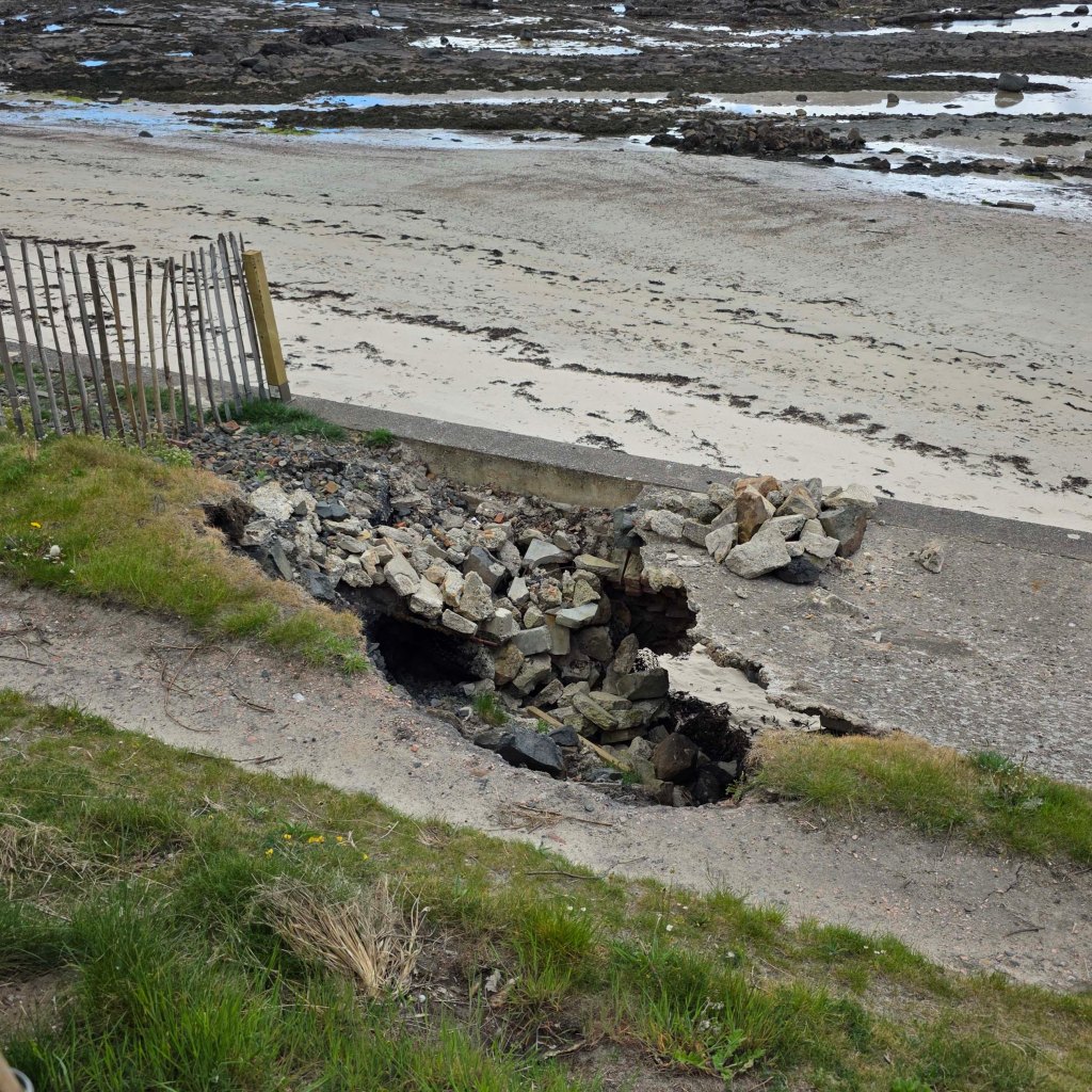 After descending one particularly steep flight of stone stairs, I discovered the spot which had caused all of the drama: a deep hole in the seawall, around which the Fife Coast and Countryside Trust had duly constructed a barrier to prevent injury. In proper Scottish fashion, walkers had created a secondary trail round the barrier, and it was easily passed by.