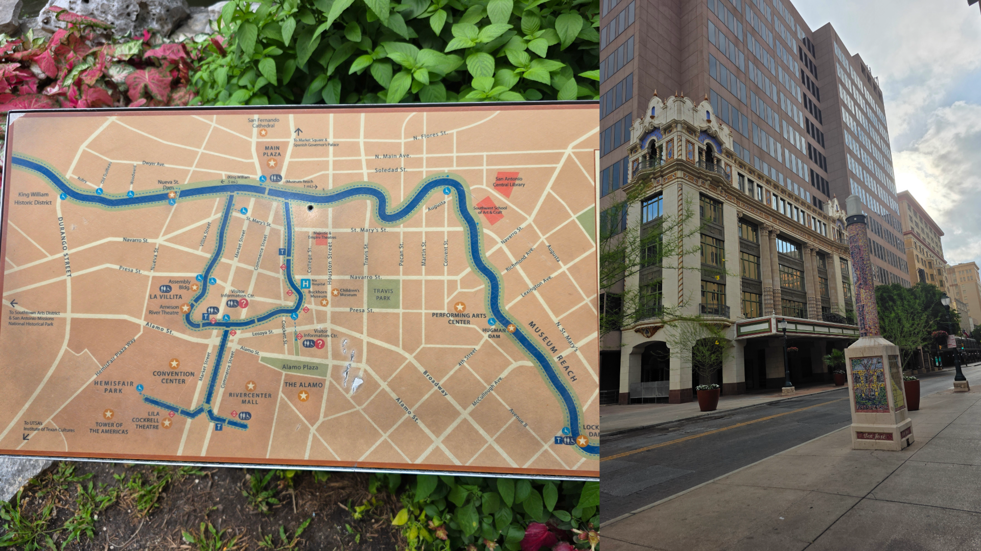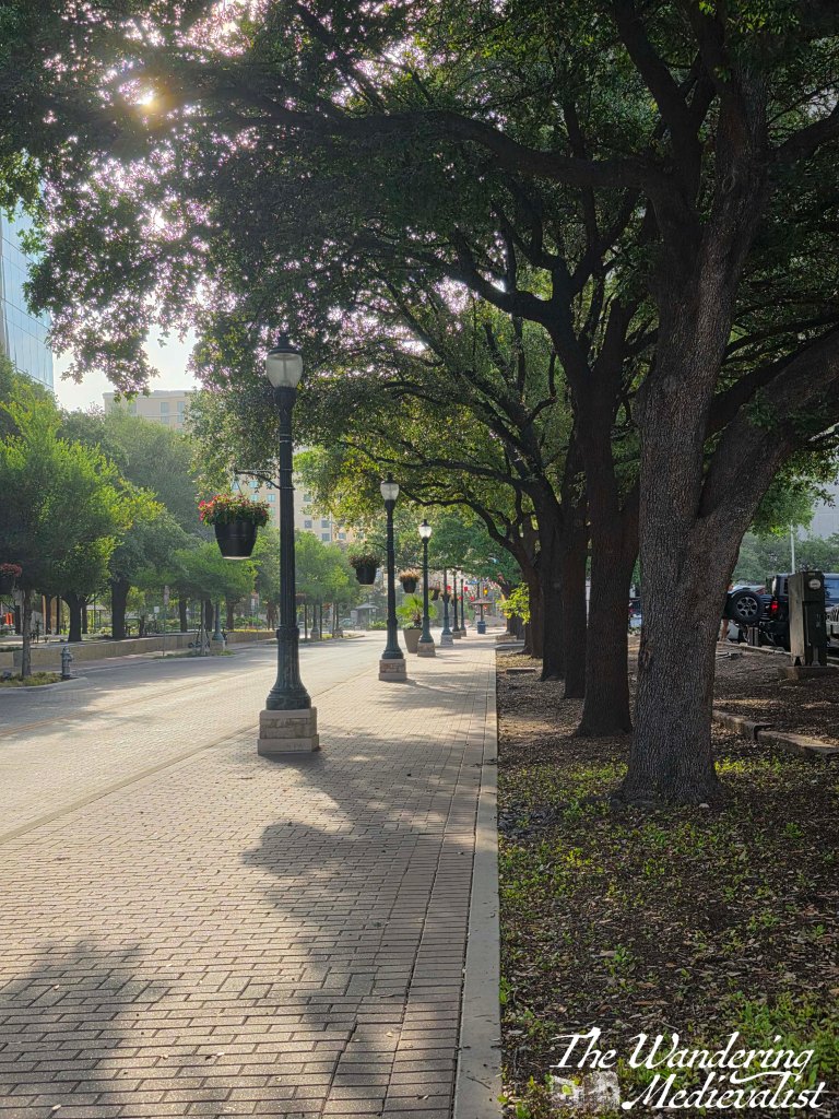 On my final night in San Antonio, some colleagues and I had a relaxing dinner sitting on the River Walk and enjoying a light breeze, people watching as tourist families from around the world wandered by. As evening fell, I walked back towards my hotel and was delighted to see the incredibly beautiful street lamp you see in half of the picture above. I had passed it in the daylight, but at night it was even more stunning.
