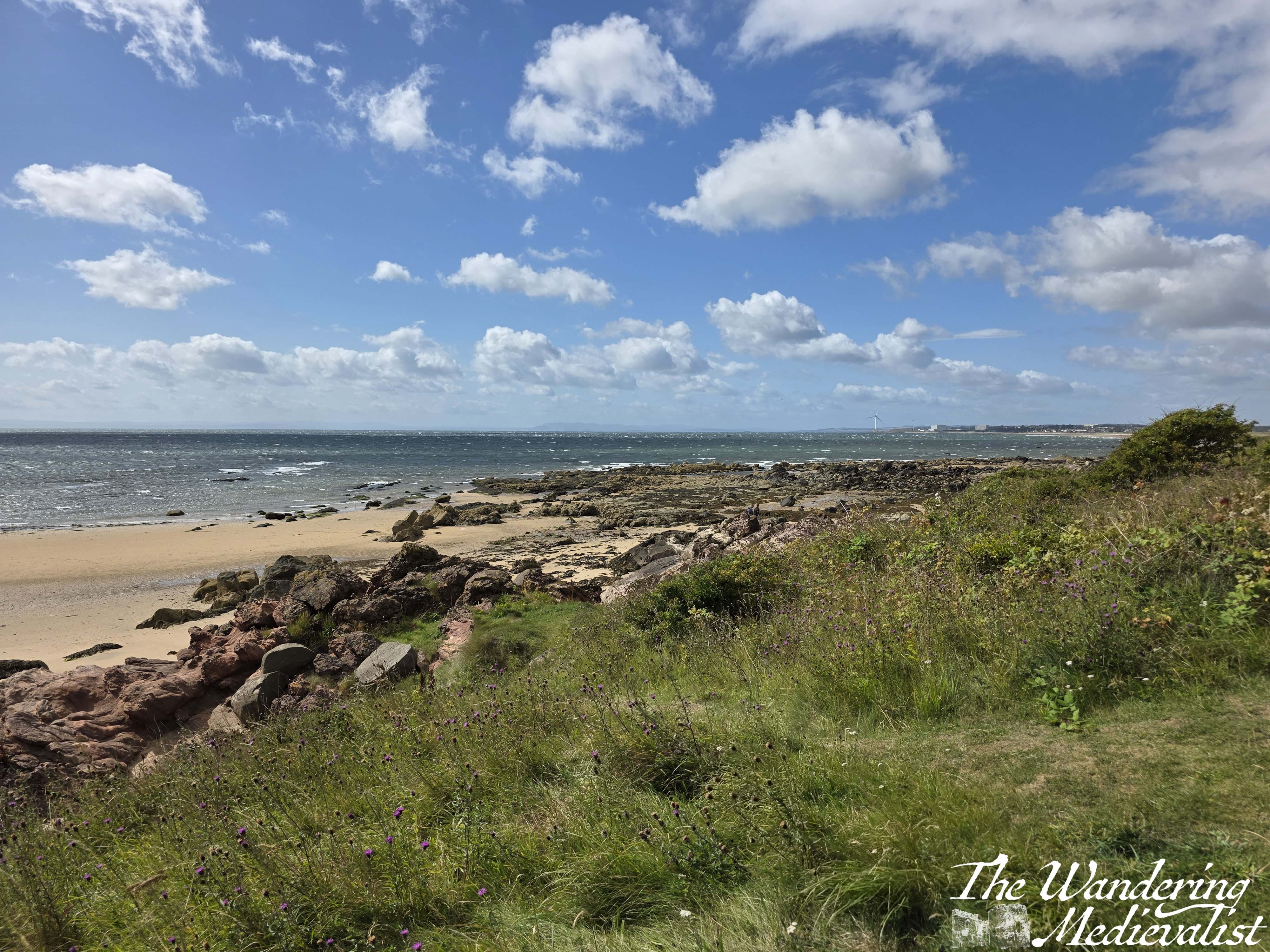 Another note – one of the aspects of the Fife Coastal Path about which I am continually impressed is how you can turn a relatively unexciting-looking corner and suddenly be faced with a jaw-dropping vista. It has happened so many times now that I can’t even count, but I am always amazed. It really makes the heat, sweat, bugs, and bouncing around on public transport worth the effort. Large portions of the path are quiet, so I am often on my own, astounded by the peace and beauty, and counting myself lucky that I have the opportunity to pursue this goal.
