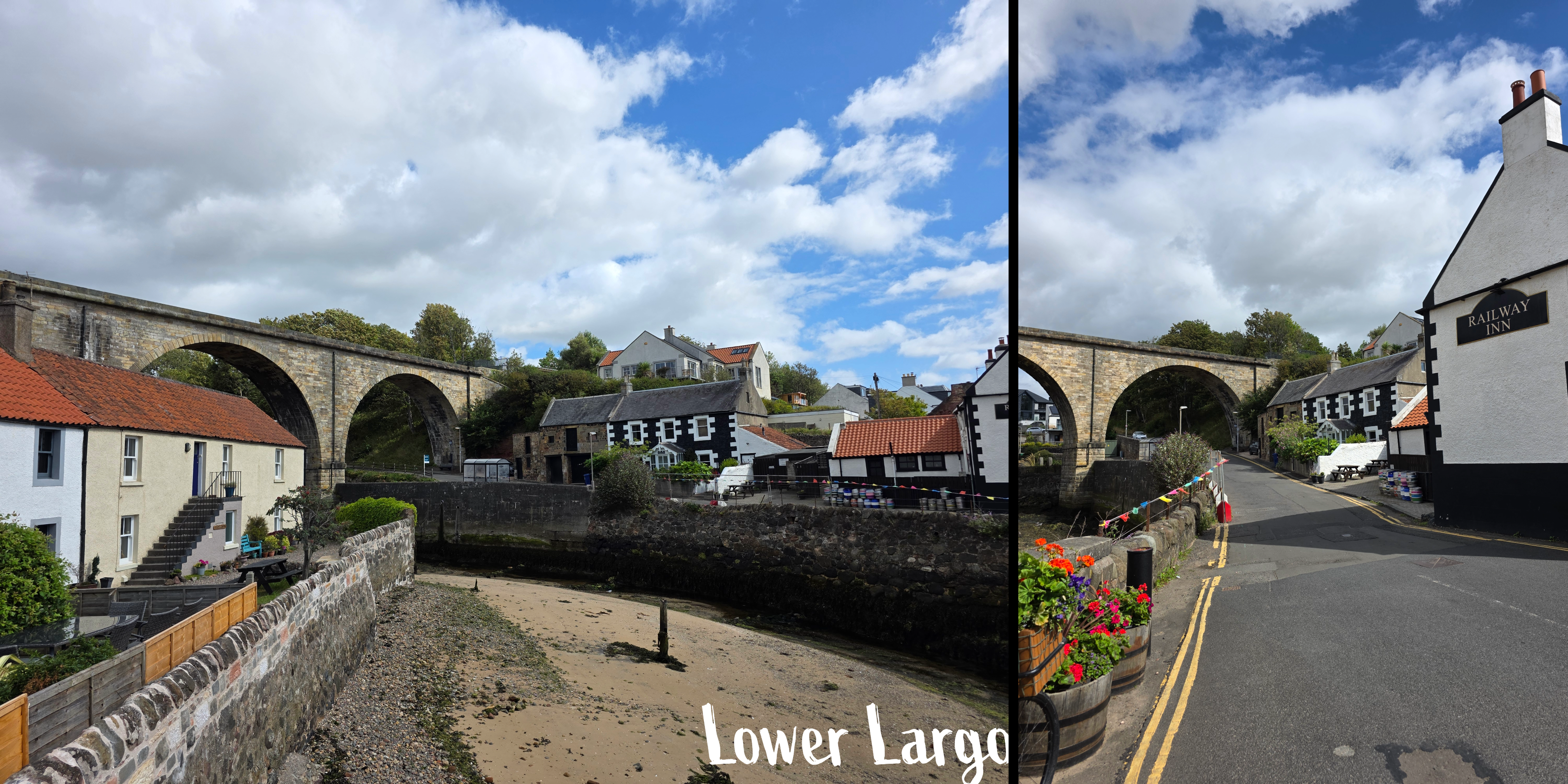 As the road winds down into the town, be careful as there is not always an obvious sidewalk; this feels much more like the towns of Anstruther and Crail, and shortly the road crosses a narrow bridge over the harbour. Ahead is the Crusoe, a popular local restaurant, and to the left a beautiful old mid-eighteenth century inn, the Railway Inn, offers bar snacks and a beer garden.