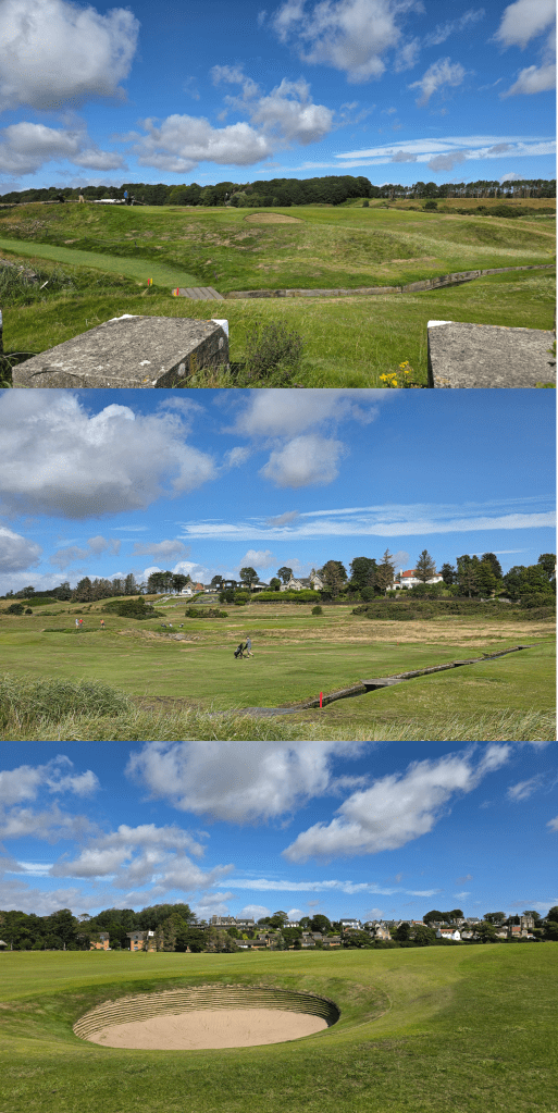 Sure enough, the sign for the Coastal Path clearly directed walkers across the course at the burn – I missed it entirely, probably too busy with the burn itself – which is considerably further from the fairway and so safer. Annoyed at myself, I crossed the green and joined a dirt track which soon led into the residential area. The homes here are lovely with abundant gardens, and there are stern signs warning that dog walking must not take place on the golf course.