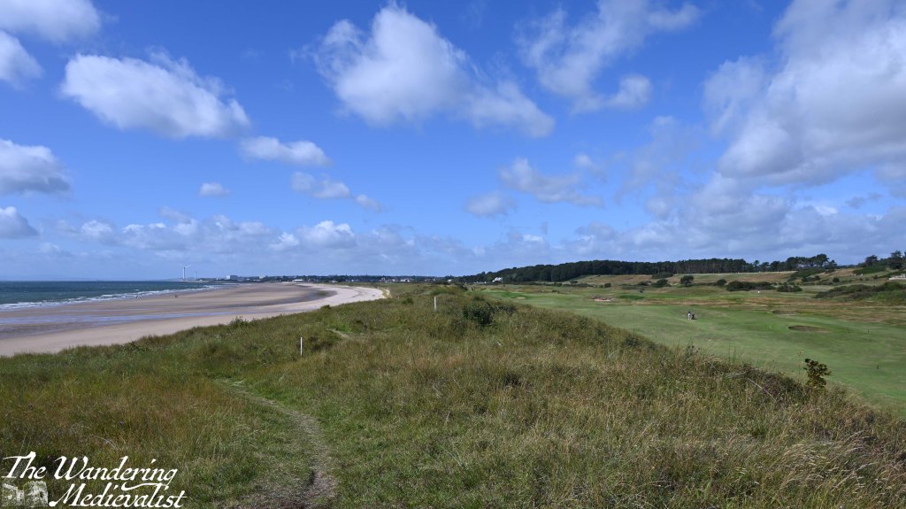 At this point the Coastal Path signage is scarce, but there really isn’t any other option but to follow the road. On the side away from the beach, I eventually passed the Leven Golfing Society – a large red brick building – and enjoyed a nice vista across the golf course to the Victorian-era cottages beyond.